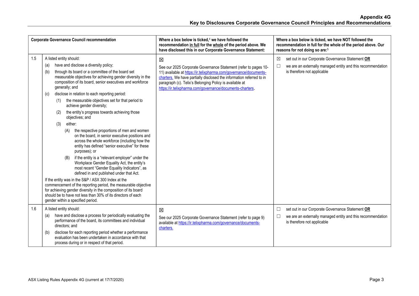 Appendix 4G Key to Disclosures Corporate Governance Council Principles and Recommendations ASX Listing Rules Appendix 4G (current at 17/7/2020) Page 3 Corporate Governance Council recommendation Where a box below is ticked,4 we have followed the recommendation in full for the whole of the period above. We have disclosed this in our Corporate Governance Statement: Where a box below is ticked, we have NOT followed the recommendation in full for the whole of the period above. Our reasons for not doing so are:5 1.5 A listed entity should: (a) have and disclose a diversity policy; (b) through its board or a committee of the board set measurable objectives for achieving gender diversity in the composition of its board, senior executives and workforce generally; and (c) disclose in relation to each reporting period: (1) the measurable objectives set for that period to achieve gender diversity; (2) the entity’s progress towards achieving those objectives; and (3) either: (A) the respective proportions of men and women on the board, in senior executive positions and across the whole workforce (including how the entity has defined “senior executive” for these purposes); or (B) if the entity is a “relevant employer” under the Workplace Gender Equality Act, the entity’s most recent “Gender Equality Indicators”, as defined in and published under that Act. If the entity was in the S&P / ASX 300 Index at the commencement of the reporting period, the measurable objective for achieving gender diversity in the composition of its board should be to have not less than 30% of its directors of each gender within a specified period. ☒ See our 2025 Corporate Governance Statement (refer to pages 10- 11) available at https://ir.telixpharma.com/governance/documents- charters. We have partially disclosed the information referred to in paragraph (c). Telix’s Belonging Policy is available at https://ir.telixpharma.com/governance/documents-charters. ☒ set out in our Corporate Governance Statement OR ☐ we are an externally managed entity and this recommendation is therefore not applicable 1.6 A listed entity should: (a) have and disclose a process for periodically evaluating the performance of the board, its committees and individual directors; and (b) disclose for each reporting period whether a performance evaluation has been undertaken in accordance with that process during or in respect of that period. ☒ See our 2025 Corporate Governance Statement (refer to page 9) available at https://ir.telixpharma.com/governance/documents- charters. ☐ set out in our Corporate Governance Statement OR ☐ we are an externally managed entity and this recommendation is therefore not applicable