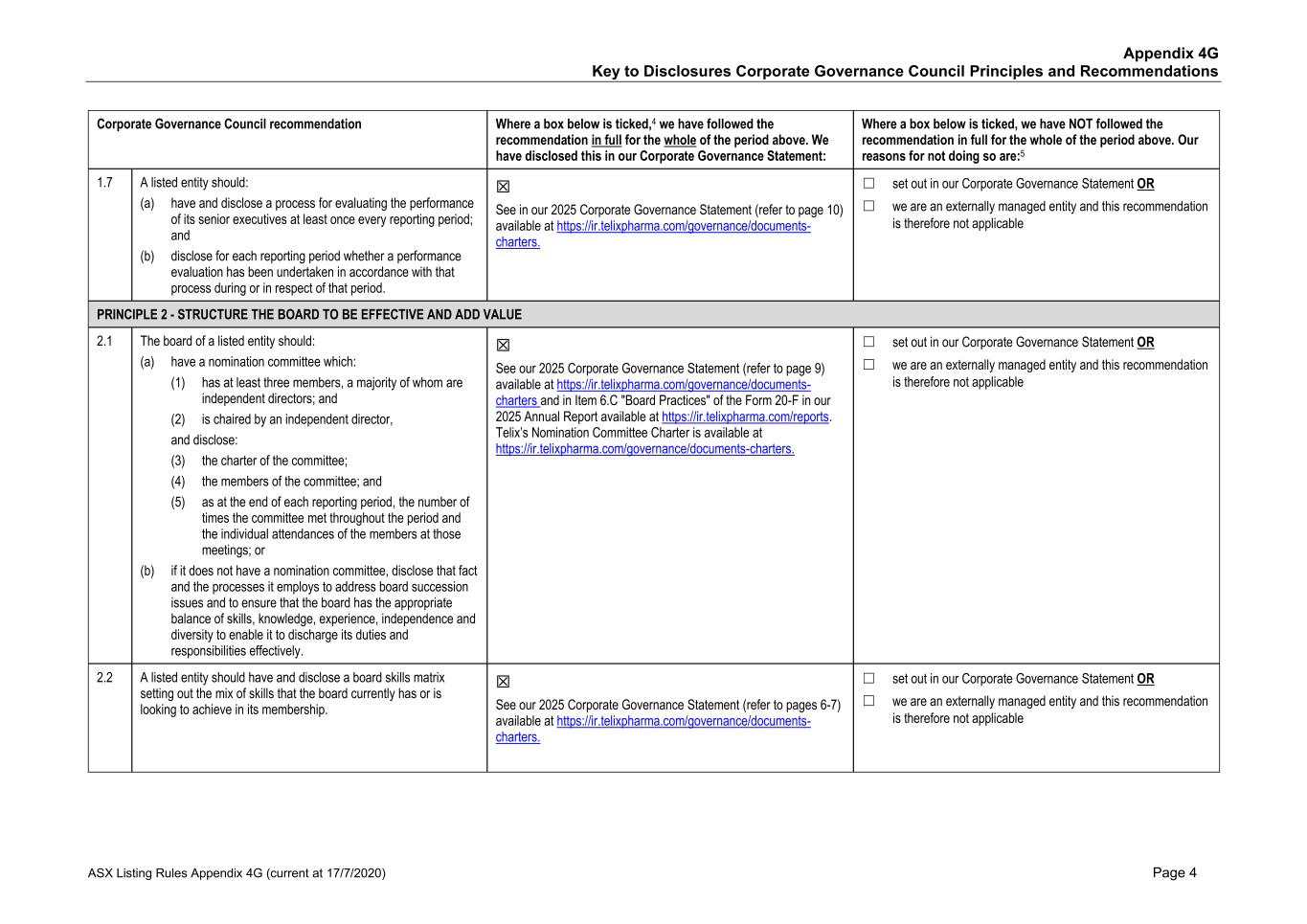 Appendix 4G Key to Disclosures Corporate Governance Council Principles and Recommendations ASX Listing Rules Appendix 4G (current at 17/7/2020) Page 4 Corporate Governance Council recommendation Where a box below is ticked,4 we have followed the recommendation in full for the whole of the period above. We have disclosed this in our Corporate Governance Statement: Where a box below is ticked, we have NOT followed the recommendation in full for the whole of the period above. Our reasons for not doing so are:5 1.7 A listed entity should: (a) have and disclose a process for evaluating the performance of its senior executives at least once every reporting period; and (b) disclose for each reporting period whether a performance evaluation has been undertaken in accordance with that process during or in respect of that period. ☒ See in our 2025 Corporate Governance Statement (refer to page 10) available at https://ir.telixpharma.com/governance/documents- charters. ☐ set out in our Corporate Governance Statement OR ☐ we are an externally managed entity and this recommendation is therefore not applicable PRINCIPLE 2 - STRUCTURE THE BOARD TO BE EFFECTIVE AND ADD VALUE 2.1 The board of a listed entity should: (a) have a nomination committee which: (1) has at least three members, a majority of whom are independent directors; and (2) is chaired by an independent director, and disclose: (3) the charter of the committee; (4) the members of the committee; and (5) as at the end of each reporting period, the number of times the committee met throughout the period and the individual attendances of the members at those meetings; or (b) if it does not have a nomination committee, disclose that fact and the processes it employs to address board succession issues and to ensure that the board has the appropriate balance of skills, knowledge, experience, independence and diversity to enable it to discharge its duties and responsibilities effectively. ☒ See our 2025 Corporate Governance Statement (refer to page 9) available at https://ir.telixpharma.com/governance/documents- charters and in Item 6.C "Board Practices" of the Form 20-F in our 2025 Annual Report available at https://ir.telixpharma.com/reports. Telix’s Nomination Committee Charter is available at https://ir.telixpharma.com/governance/documents-charters. ☐ set out in our Corporate Governance Statement OR ☐ we are an externally managed entity and this recommendation is therefore not applicable 2.2 A listed entity should have and disclose a board skills matrix setting out the mix of skills that the board currently has or is looking to achieve in its membership. ☒ See our 2025 Corporate Governance Statement (refer to pages 6-7) available at https://ir.telixpharma.com/governance/documents- charters. ☐ set out in our Corporate Governance Statement OR ☐ we are an externally managed entity and this recommendation is therefore not applicable