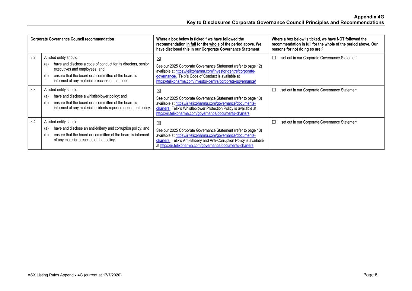 Appendix 4G Key to Disclosures Corporate Governance Council Principles and Recommendations ASX Listing Rules Appendix 4G (current at 17/7/2020) Page 6 Corporate Governance Council recommendation Where a box below is ticked,4 we have followed the recommendation in full for the whole of the period above. We have disclosed this in our Corporate Governance Statement: Where a box below is ticked, we have NOT followed the recommendation in full for the whole of the period above. Our reasons for not doing so are:5 3.2 A listed entity should: (a) have and disclose a code of conduct for its directors, senior executives and employees; and (b) ensure that the board or a committee of the board is informed of any material breaches of that code. ☒ See our 2025 Corporate Governance Statement (refer to page 12) available at https://telixpharma.com/investor-centre/corporate- governance/. Telix’s Code of Conduct is available at https://telixpharma.com/investor-centre/corporate-governance/ ☐ set out in our Corporate Governance Statement 3.3 A listed entity should: (a) have and disclose a whistleblower policy; and (b) ensure that the board or a committee of the board is informed of any material incidents reported under that policy. ☒ See our 2025 Corporate Governance Statement (refer to page 13) available at https://ir.telixpharma.com/governance/documents- charters. Telix’s Whistleblower Protection Policy is available at https://ir.telixpharma.com/governance/documents-charters ☐ set out in our Corporate Governance Statement 3.4 A listed entity should: (a) have and disclose an anti-bribery and corruption policy; and (b) ensure that the board or committee of the board is informed of any material breaches of that policy. ☒ See our 2025 Corporate Governance Statement (refer to page 13) available at https://ir.telixpharma.com/governance/documents- charters. Telix’s Anti-Bribery and Anti-Corruption Policy is available at https://ir.telixpharma.com/governance/documents-charters ☐ set out in our Corporate Governance Statement
