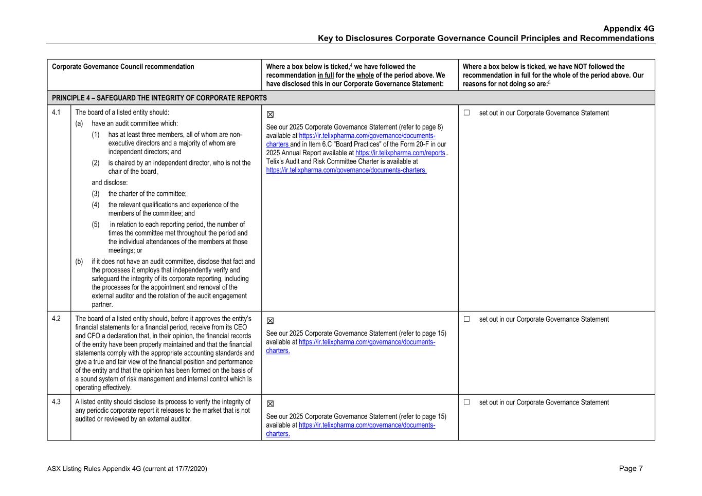 Appendix 4G Key to Disclosures Corporate Governance Council Principles and Recommendations ASX Listing Rules Appendix 4G (current at 17/7/2020) Page 7 Corporate Governance Council recommendation Where a box below is ticked,4 we have followed the recommendation in full for the whole of the period above. We have disclosed this in our Corporate Governance Statement: Where a box below is ticked, we have NOT followed the recommendation in full for the whole of the period above. Our reasons for not doing so are:5 PRINCIPLE 4 – SAFEGUARD THE INTEGRITY OF CORPORATE REPORTS 4.1 The board of a listed entity should: (a) have an audit committee which: (1) has at least three members, all of whom are non- executive directors and a majority of whom are independent directors; and (2) is chaired by an independent director, who is not the chair of the board, and disclose: (3) the charter of the committee; (4) the relevant qualifications and experience of the members of the committee; and (5) in relation to each reporting period, the number of times the committee met throughout the period and the individual attendances of the members at those meetings; or (b) if it does not have an audit committee, disclose that fact and the processes it employs that independently verify and safeguard the integrity of its corporate reporting, including the processes for the appointment and removal of the external auditor and the rotation of the audit engagement partner. ☒ See our 2025 Corporate Governance Statement (refer to page 8) available at https://ir.telixpharma.com/governance/documents- charters and in Item 6.C "Board Practices" of the Form 20-F in our 2025 Annual Report available at https://ir.telixpharma.com/reports.. Telix’s Audit and Risk Committee Charter is available at https://ir.telixpharma.com/governance/documents-charters. ☐ set out in our Corporate Governance Statement 4.2 The board of a listed entity should, before it approves the entity’s financial statements for a financial period, receive from its CEO and CFO a declaration that, in their opinion, the financial records of the entity have been properly maintained and that the financial statements comply with the appropriate accounting standards and give a true and fair view of the financial position and performance of the entity and that the opinion has been formed on the basis of a sound system of risk management and internal control which is operating effectively. ☒ See our 2025 Corporate Governance Statement (refer to page 15) available at https://ir.telixpharma.com/governance/documents- charters. ☐ set out in our Corporate Governance Statement 4.3 A listed entity should disclose its process to verify the integrity of any periodic corporate report it releases to the market that is not audited or reviewed by an external auditor. ☒ See our 2025 Corporate Governance Statement (refer to page 15) available at https://ir.telixpharma.com/governance/documents- charters. ☐ set out in our Corporate Governance Statement