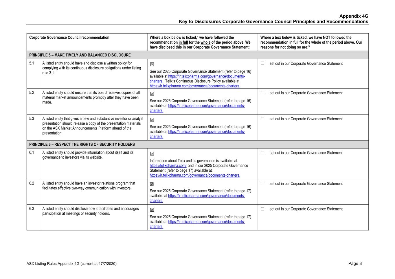Appendix 4G Key to Disclosures Corporate Governance Council Principles and Recommendations ASX Listing Rules Appendix 4G (current at 17/7/2020) Page 8 Corporate Governance Council recommendation Where a box below is ticked,4 we have followed the recommendation in full for the whole of the period above. We have disclosed this in our Corporate Governance Statement: Where a box below is ticked, we have NOT followed the recommendation in full for the whole of the period above. Our reasons for not doing so are:5 PRINCIPLE 5 – MAKE TIMELY AND BALANCED DISCLOSURE 5.1 A listed entity should have and disclose a written policy for complying with its continuous disclosure obligations under listing rule 3.1. ☒ See our 2025 Corporate Governance Statement (refer to page 16) available at https://ir.telixpharma.com/governance/documents- charters. Telix’s Continuous Disclosure Policy available at https://ir.telixpharma.com/governance/documents-charters. ☐ set out in our Corporate Governance Statement 5.2 A listed entity should ensure that its board receives copies of all material market announcements promptly after they have been made. ☒ See our 2025 Corporate Governance Statement (refer to page 16) available at https://ir.telixpharma.com/governance/documents- charters. ☐ set out in our Corporate Governance Statement 5.3 A listed entity that gives a new and substantive investor or analyst presentation should release a copy of the presentation materials on the ASX Market Announcements Platform ahead of the presentation. ☒ See our 2025 Corporate Governance Statement (refer to page 16) available at https://ir.telixpharma.com/governance/documents- charters. ☐ set out in our Corporate Governance Statement PRINCIPLE 6 – RESPECT THE RIGHTS OF SECURITY HOLDERS 6.1 A listed entity should provide information about itself and its governance to investors via its website. ☒ Information about Telix and its governance is available at https://telixpharma.com/ and in our 2025 Corporate Governance Statement (refer to page 17) available at https://ir.telixpharma.com/governance/documents-charters. ☐ set out in our Corporate Governance Statement 6.2 A listed entity should have an investor relations program that facilitates effective two-way communication with investors. ☒ See our 2025 Corporate Governance Statement (refer to page 17) available at https://ir.telixpharma.com/governance/documents- charters. ☐ set out in our Corporate Governance Statement 6.3 A listed entity should disclose how it facilitates and encourages participation at meetings of security holders. ☒ See our 2025 Corporate Governance Statement (refer to page 17) available at https://ir.telixpharma.com/governance/documents- charters. ☐ set out in our Corporate Governance Statement