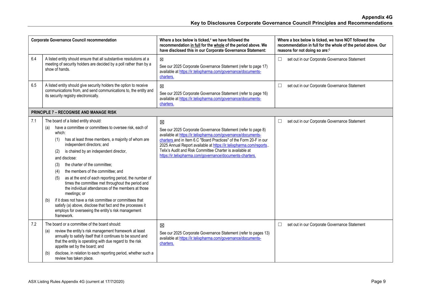 Appendix 4G Key to Disclosures Corporate Governance Council Principles and Recommendations ASX Listing Rules Appendix 4G (current at 17/7/2020) Page 9 Corporate Governance Council recommendation Where a box below is ticked,4 we have followed the recommendation in full for the whole of the period above. We have disclosed this in our Corporate Governance Statement: Where a box below is ticked, we have NOT followed the recommendation in full for the whole of the period above. Our reasons for not doing so are:5 6.4 A listed entity should ensure that all substantive resolutions at a meeting of security holders are decided by a poll rather than by a show of hands. ☒ See our 2025 Corporate Governance Statement (refer to page 17) available at https://ir.telixpharma.com/governance/documents- charters. ☐ set out in our Corporate Governance Statement 6.5 A listed entity should give security holders the option to receive communications from, and send communications to, the entity and its security registry electronically. ☒ See our 2025 Corporate Governance Statement (refer to page 16) available at https://ir.telixpharma.com/governance/documents- charters. ☐ set out in our Corporate Governance Statement PRINCIPLE 7 – RECOGNISE AND MANAGE RISK 7.1 The board of a listed entity should: (a) have a committee or committees to oversee risk, each of which: (1) has at least three members, a majority of whom are independent directors; and (2) is chaired by an independent director, and disclose: (3) the charter of the committee; (4) the members of the committee; and (5) as at the end of each reporting period, the number of times the committee met throughout the period and the individual attendances of the members at those meetings; or (b) if it does not have a risk committee or committees that satisfy (a) above, disclose that fact and the processes it employs for overseeing the entity’s risk management framework. ☒ See our 2025 Corporate Governance Statement (refer to page 8) available at https://ir.telixpharma.com/governance/documents- charters and in Item 6.C "Board Practices" of the Form 20-F in our 2025 Annual Report available at https://ir.telixpharma.com/reports.. Telix’s Audit and Risk Committee Charter is available at https://ir.telixpharma.com/governance/documents-charters. ☐ set out in our Corporate Governance Statement 7.2 The board or a committee of the board should: (a) review the entity’s risk management framework at least annually to satisfy itself that it continues to be sound and that the entity is operating with due regard to the risk appetite set by the board; and (b) disclose, in relation to each reporting period, whether such a review has taken place. ☒ See our 2025 Corporate Governance Statement (refer to pages 13) available at https://ir.telixpharma.com/governance/documents- charters. ☐ set out in our Corporate Governance Statement