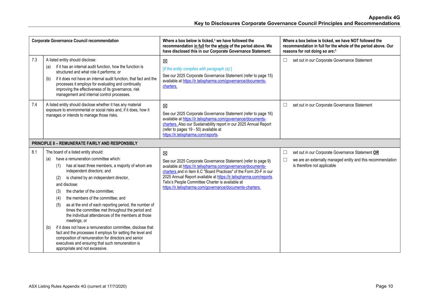 Appendix 4G Key to Disclosures Corporate Governance Council Principles and Recommendations ASX Listing Rules Appendix 4G (current at 17/7/2020) Page 10 Corporate Governance Council recommendation Where a box below is ticked,4 we have followed the recommendation in full for the whole of the period above. We have disclosed this in our Corporate Governance Statement: Where a box below is ticked, we have NOT followed the recommendation in full for the whole of the period above. Our reasons for not doing so are:5 7.3 A listed entity should disclose: (a) if it has an internal audit function, how the function is structured and what role it performs; or (b) if it does not have an internal audit function, that fact and the processes it employs for evaluating and continually improving the effectiveness of its governance, risk management and internal control processes. ☒ [If the entity complies with paragraph (a):] See our 2025 Corporate Governance Statement (refer to page 15) available at https://ir.telixpharma.com/governance/documents- charters. ☐ set out in our Corporate Governance Statement 7.4 A listed entity should disclose whether it has any material exposure to environmental or social risks and, if it does, how it manages or intends to manage those risks. ☒ See our 2025 Corporate Governance Statement (refer to page 16) available at https://ir.telixpharma.com/governance/documents- charters. Also our Sustainability report in our 2025 Annual Report (refer to pages 19 - 50) available at https://ir.telixpharma.com/reports. ☐ set out in our Corporate Governance Statement PRINCIPLE 8 – REMUNERATE FAIRLY AND RESPONSIBLY 8.1 The board of a listed entity should: (a) have a remuneration committee which: (1) has at least three members, a majority of whom are independent directors; and (2) is chaired by an independent director, and disclose: (3) the charter of the committee; (4) the members of the committee; and (5) as at the end of each reporting period, the number of times the committee met throughout the period and the individual attendances of the members at those meetings; or (b) if it does not have a remuneration committee, disclose that fact and the processes it employs for setting the level and composition of remuneration for directors and senior executives and ensuring that such remuneration is appropriate and not excessive. ☒ See our 2025 Corporate Governance Statement (refer to page 9) available at https://ir.telixpharma.com/governance/documents- charters and in Item 6.C "Board Practices" of the Form 20-F in our 2025 Annual Report available at https://ir.telixpharma.com/reports. Telix’s People Committee Charter is available at https://ir.telixpharma.com/governance/documents-charters. ☐ set out in our Corporate Governance Statement OR ☐ we are an externally managed entity and this recommendation is therefore not applicable