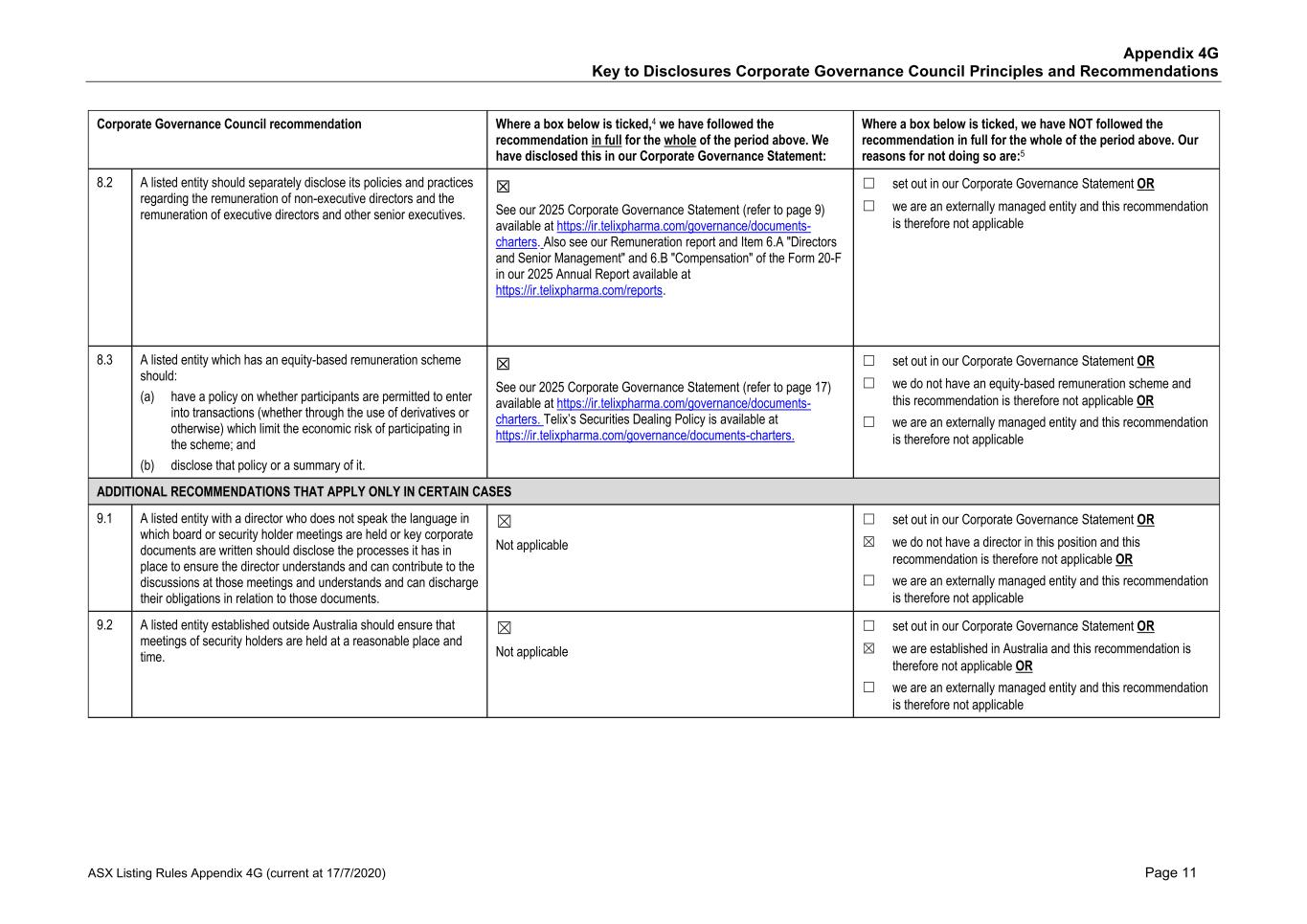 Appendix 4G Key to Disclosures Corporate Governance Council Principles and Recommendations ASX Listing Rules Appendix 4G (current at 17/7/2020) Page 11 Corporate Governance Council recommendation Where a box below is ticked,4 we have followed the recommendation in full for the whole of the period above. We have disclosed this in our Corporate Governance Statement: Where a box below is ticked, we have NOT followed the recommendation in full for the whole of the period above. Our reasons for not doing so are:5 8.2 A listed entity should separately disclose its policies and practices regarding the remuneration of non-executive directors and the remuneration of executive directors and other senior executives. ☒ See our 2025 Corporate Governance Statement (refer to page 9) available at https://ir.telixpharma.com/governance/documents- charters. Also see our Remuneration report and Item 6.A "Directors and Senior Management" and 6.B "Compensation" of the Form 20-F in our 2025 Annual Report available at https://ir.telixpharma.com/reports. ☐ set out in our Corporate Governance Statement OR ☐ we are an externally managed entity and this recommendation is therefore not applicable 8.3 A listed entity which has an equity-based remuneration scheme should: (a) have a policy on whether participants are permitted to enter into transactions (whether through the use of derivatives or otherwise) which limit the economic risk of participating in the scheme; and (b) disclose that policy or a summary of it. ☒ See our 2025 Corporate Governance Statement (refer to page 17) available at https://ir.telixpharma.com/governance/documents- charters. Telix’s Securities Dealing Policy is available at https://ir.telixpharma.com/governance/documents-charters. ☐ set out in our Corporate Governance Statement OR ☐ we do not have an equity-based remuneration scheme and this recommendation is therefore not applicable OR ☐ we are an externally managed entity and this recommendation is therefore not applicable ADDITIONAL RECOMMENDATIONS THAT APPLY ONLY IN CERTAIN CASES 9.1 A listed entity with a director who does not speak the language in which board or security holder meetings are held or key corporate documents are written should disclose the processes it has in place to ensure the director understands and can contribute to the discussions at those meetings and understands and can discharge their obligations in relation to those documents. ☒ Not applicable ☐ set out in our Corporate Governance Statement OR ☒ we do not have a director in this position and this recommendation is therefore not applicable OR ☐ we are an externally managed entity and this recommendation is therefore not applicable 9.2 A listed entity established outside Australia should ensure that meetings of security holders are held at a reasonable place and time. ☒ Not applicable ☐ set out in our Corporate Governance Statement OR ☒ we are established in Australia and this recommendation is therefore not applicable OR ☐ we are an externally managed entity and this recommendation is therefore not applicable