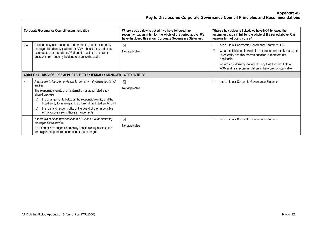 Appendix 4G Key to Disclosures Corporate Governance Council Principles and Recommendations ASX Listing Rules Appendix 4G (current at 17/7/2020) Page 12 Corporate Governance Council recommendation Where a box below is ticked,4 we have followed the recommendation in full for the whole of the period above. We have disclosed this in our Corporate Governance Statement: Where a box below is ticked, we have NOT followed the recommendation in full for the whole of the period above. Our reasons for not doing so are:5 9.3 A listed entity established outside Australia, and an externally managed listed entity that has an AGM, should ensure that its external auditor attends its AGM and is available to answer questions from security holders relevant to the audit. ☒ Not applicable ☐ set out in our Corporate Governance Statement OR ☒ we are established in Australia and not an externally managed listed entity and this recommendation is therefore not applicable ☐ we are an externally managed entity that does not hold an AGM and this recommendation is therefore not applicable ADDITIONAL DISCLOSURES APPLICABLE TO EXTERNALLY MANAGED LISTED ENTITIES - Alternative to Recommendation 1.1 for externally managed listed entities: The responsible entity of an externally managed listed entity should disclose: (a) the arrangements between the responsible entity and the listed entity for managing the affairs of the listed entity; and (b) the role and responsibility of the board of the responsible entity for overseeing those arrangements. ☒ Not applicable ☐ set out in our Corporate Governance Statement - Alternative to Recommendations 8.1, 8.2 and 8.3 for externally managed listed entities: An externally managed listed entity should clearly disclose the terms governing the remuneration of the manager. ☒ Not applicable ☐ set out in our Corporate Governance Statement