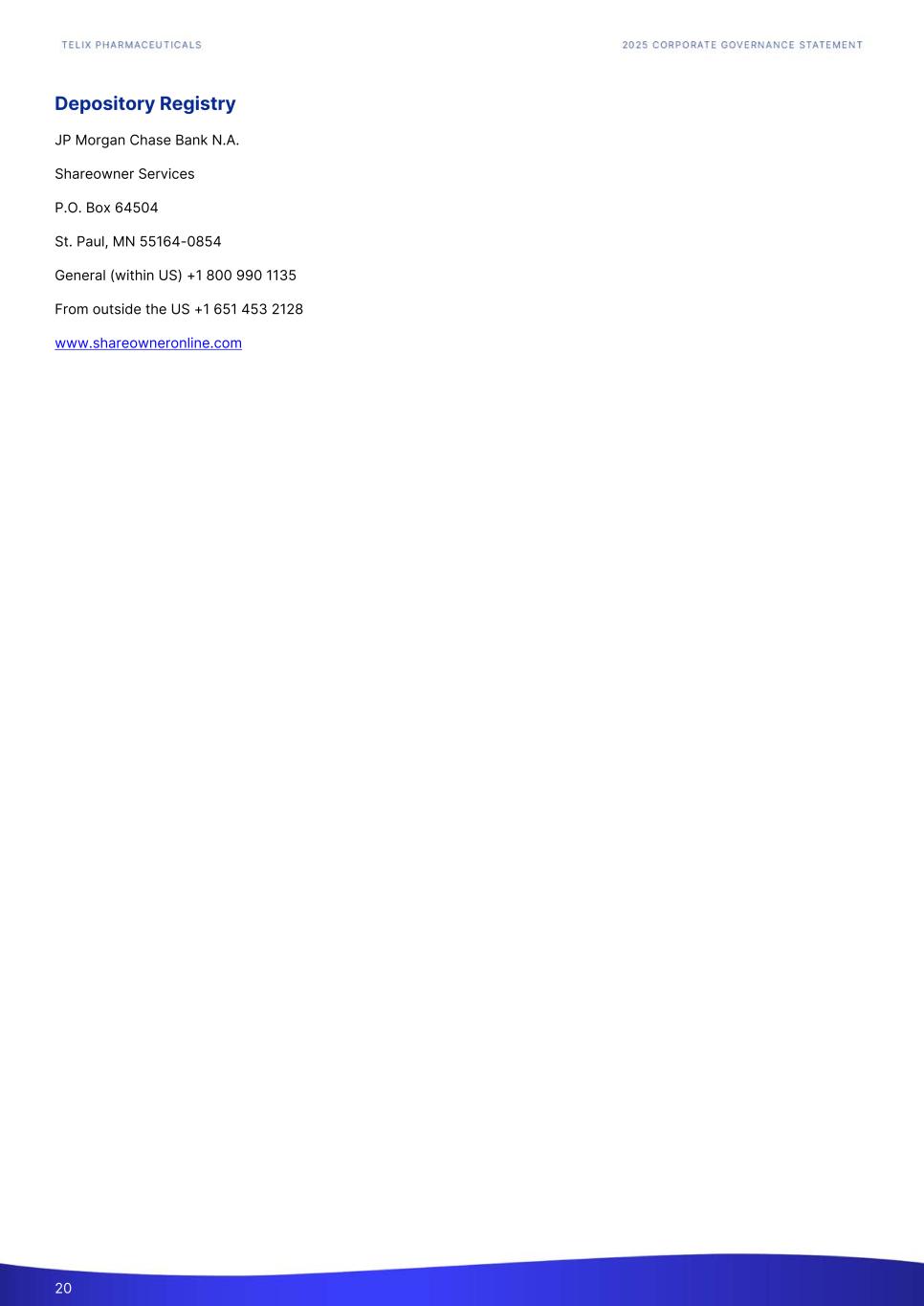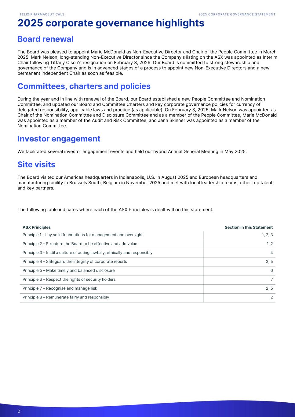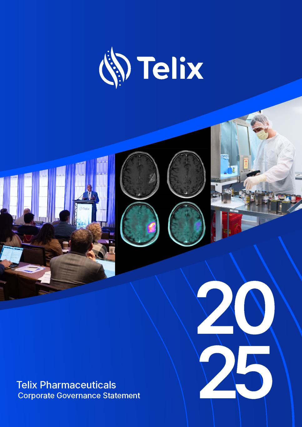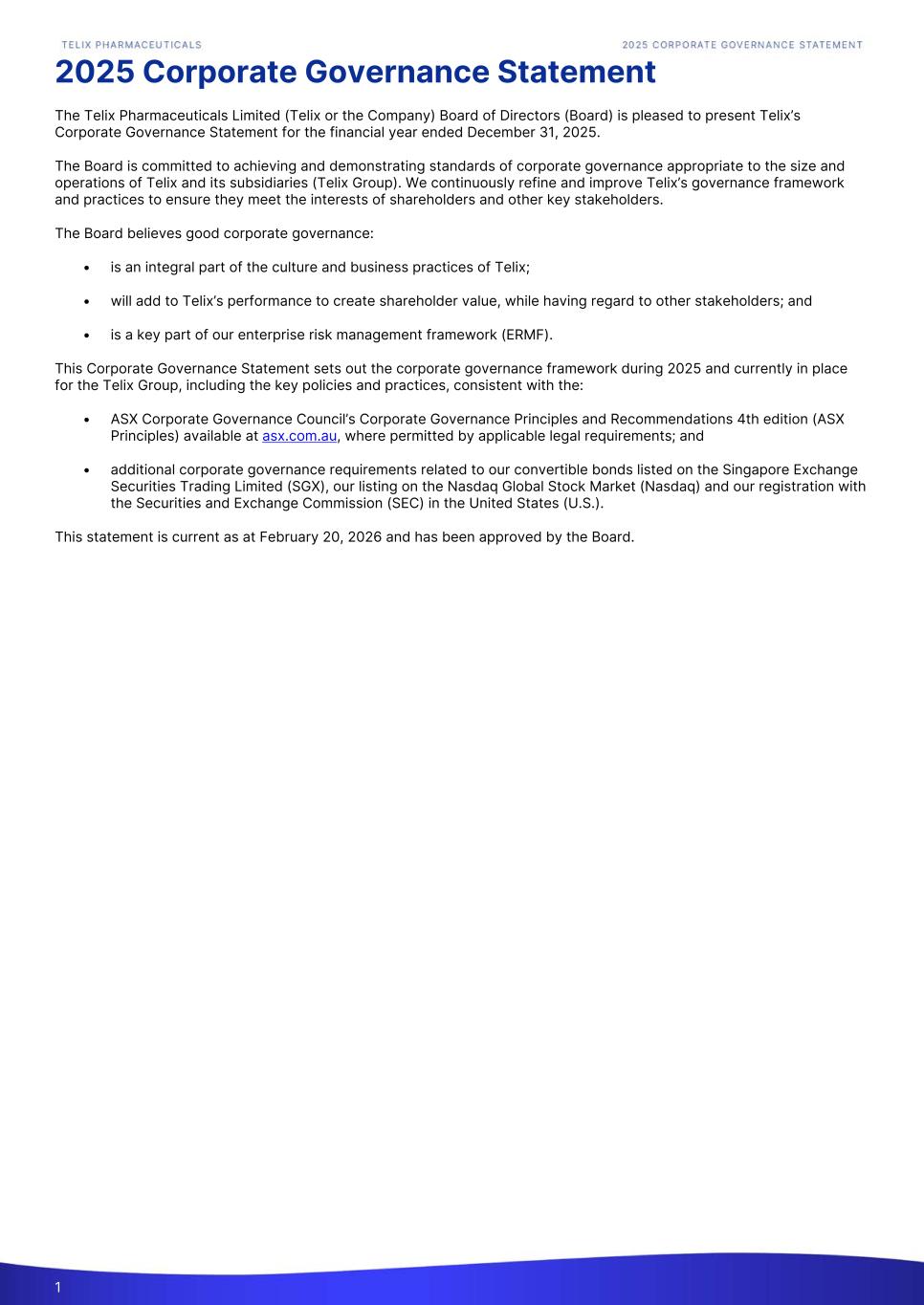 2025 Corporate Governance Statement The Telix Pharmaceuticals Limited (Telix or the Company) Board of Directors (Board) is pleased to present Telix’s Corporate Governance Statement for the financial year ended December 31, 2025. The Board is committed to achieving and demonstrating standards of corporate governance appropriate to the size and operations of Telix and its subsidiaries (Telix Group). We continuously refine and improve Telix’s governance framework and practices to ensure they meet the interests of shareholders and other key stakeholders. The Board believes good corporate governance: • is an integral part of the culture and business practices of Telix; • will add to Telix’s performance to create shareholder value, while having regard to other stakeholders; and • is a key part of our enterprise risk management framework (ERMF). This Corporate Governance Statement sets out the corporate governance framework during 2025 and currently in place for the Telix Group, including the key policies and practices, consistent with the: • ASX Corporate Governance Council’s Corporate Governance Principles and Recommendations 4th edition (ASX Principles) available at asx.com.au, where permitted by applicable legal requirements; and • additional corporate governance requirements related to our convertible bonds listed on the Singapore Exchange Securities Trading Limited (SGX), our listing on the Nasdaq Global Stock Market (Nasdaq) and our registration with the Securities and Exchange Commission (SEC) in the United States (U.S.). This statement is current as at February 20, 2026 and has been approved by the Board. 1