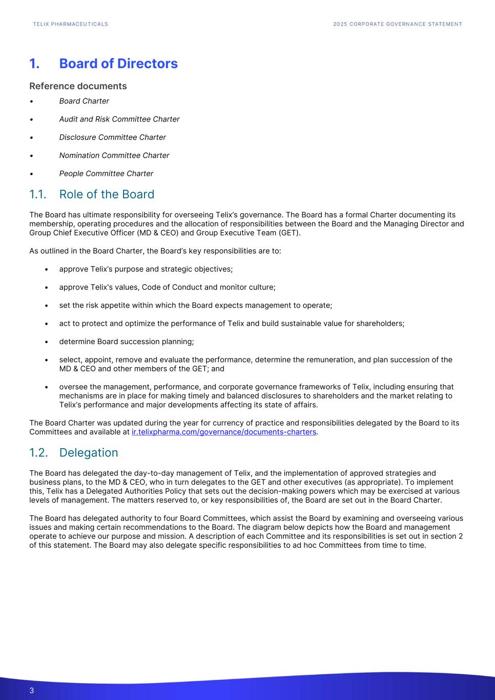 1. Board of Directors Reference documents • Board Charter • Audit and Risk Committee Charter • Disclosure Committee Charter • Nomination Committee Charter • People Committee Charter 1.1. Role of the Board The Board has ultimate responsibility for overseeing Telix’s governance. The Board has a formal Charter documenting its membership, operating procedures and the allocation of responsibilities between the Board and the Managing Director and Group Chief Executive Officer (MD & CEO) and Group Executive Team (GET). As outlined in the Board Charter, the Board’s key responsibilities are to: • approve Telix’s purpose and strategic objectives; • approve Telix's values, Code of Conduct and monitor culture; • set the risk appetite within which the Board expects management to operate; • act to protect and optimize the performance of Telix and build sustainable value for shareholders; • determine Board succession planning; • select, appoint, remove and evaluate the performance, determine the remuneration, and plan succession of the MD & CEO and other members of the GET; and • oversee the management, performance, and corporate governance frameworks of Telix, including ensuring that mechanisms are in place for making timely and balanced disclosures to shareholders and the market relating to Telix’s performance and major developments affecting its state of affairs. The Board Charter was updated during the year for currency of practice and responsibilities delegated by the Board to its Committees and available at ir.telixpharma.com/governance/documents-charters. 1.2. Delegation The Board has delegated the day-to-day management of Telix, and the implementation of approved strategies and business plans, to the MD & CEO, who in turn delegates to the GET and other executives (as appropriate). To implement this, Telix has a Delegated Authorities Policy that sets out the decision-making powers which may be exercised at various levels of management. The matters reserved to, or key responsibilities of, the Board are set out in the Board Charter. The Board has delegated authority to four Board Committees, which assist the Board by examining and overseeing various issues and making certain recommendations to the Board. The diagram below depicts how the Board and management operate to achieve our purpose and mission. A description of each Committee and its responsibilities is set out in section 2 of this statement. The Board may also delegate specific responsibilities to ad hoc Committees from time to time. 3