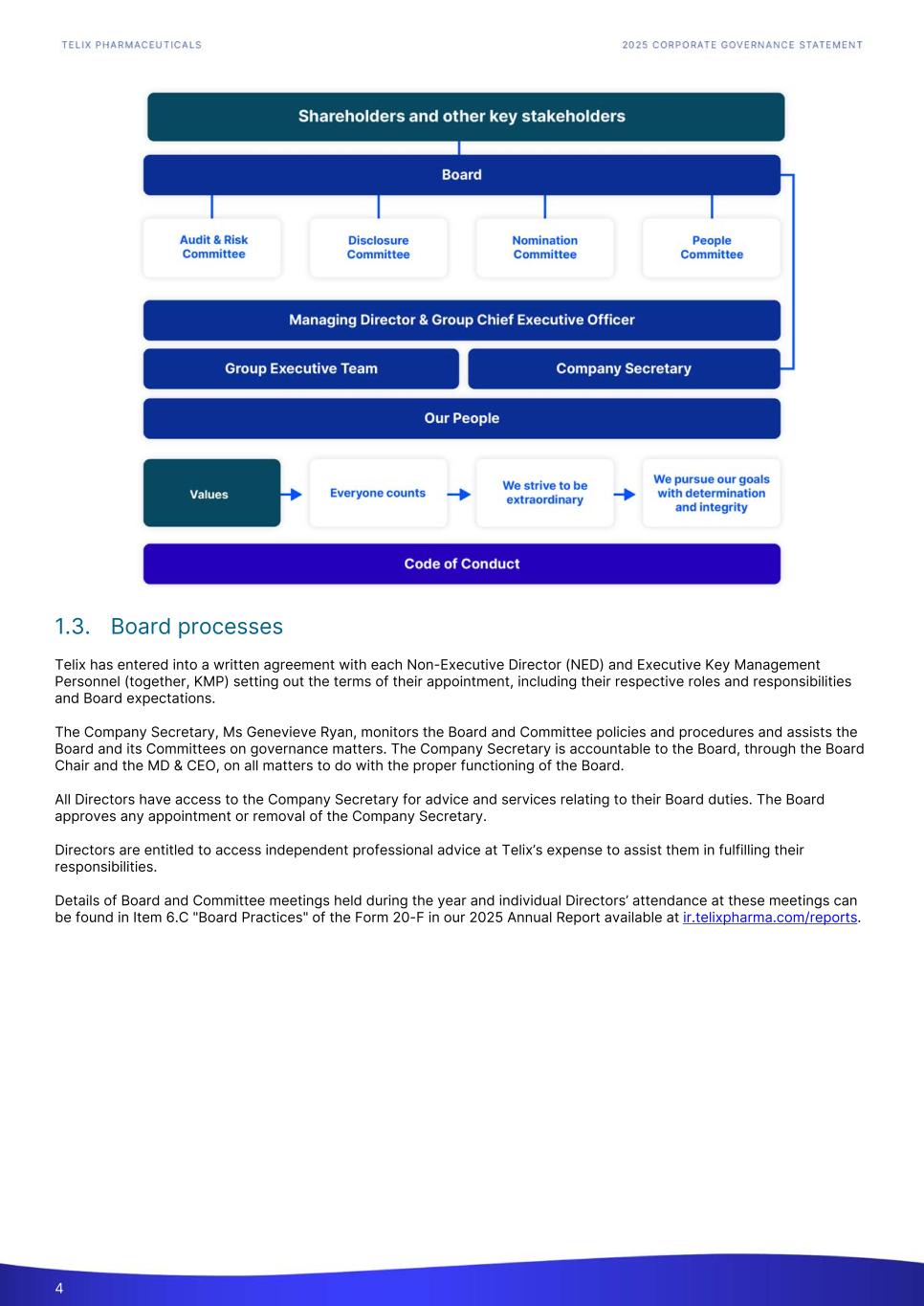 1.3. Board processes Telix has entered into a written agreement with each Non-Executive Director (NED) and Executive Key Management Personnel (together, KMP) setting out the terms of their appointment, including their respective roles and responsibilities and Board expectations. The Company Secretary, Ms Genevieve Ryan, monitors the Board and Committee policies and procedures and assists the Board and its Committees on governance matters. The Company Secretary is accountable to the Board, through the Board Chair and the MD & CEO, on all matters to do with the proper functioning of the Board. All Directors have access to the Company Secretary for advice and services relating to their Board duties. The Board approves any appointment or removal of the Company Secretary. Directors are entitled to access independent professional advice at Telix’s expense to assist them in fulfilling their responsibilities. Details of Board and Committee meetings held during the year and individual Directors’ attendance at these meetings can be found in Item 6.C "Board Practices" of the Form 20-F in our 2025 Annual Report available at ir.telixpharma.com/reports. 4