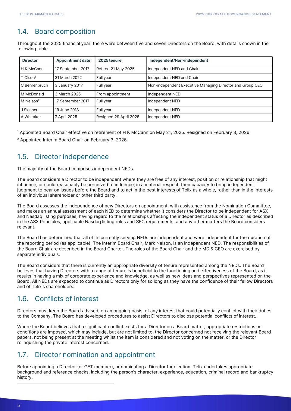 1.4. Board composition Throughout the 2025 financial year, there were between five and seven Directors on the Board, with details shown in the following table. Director Appointment date 2025 tenure Independent/Non-independent H K McCann 17 September 2017 Retired 21 May 2025 Independent NED and Chair T Olson1 31 March 2022 Full year Independent NED and Chair C Behrenbruch 3 January 2017 Full year Non-independent Executive Managing Director and Group CEO M McDonald 3 March 2025 From appointment Independent NED M Nelson2 17 September 2017 Full year Independent NED J Skinner 19 June 2018 Full year Independent NED A Whitaker 7 April 2025 Resigned 29 April 2025 Independent NED 1 Appointed Board Chair effective on retirement of H K McCann on May 21, 2025. Resigned on February 3, 2026. 2 Appointed Interim Board Chair on February 3, 2026. 1.5. Director independence The majority of the Board comprises independent NEDs. The Board considers a Director to be independent where they are free of any interest, position or relationship that might influence, or could reasonably be perceived to influence, in a material respect, their capacity to bring independent judgment to bear on issues before the Board and to act in the best interests of Telix as a whole, rather than in the interests of an individual shareholder or other third party. The Board assesses the independence of new Directors on appointment, with assistance from the Nomination Committee, and makes an annual assessment of each NED to determine whether it considers the Director to be independent for ASX and Nasdaq listing purposes, having regard to the relationships affecting the independent status of a Director as described in the ASX Principles, applicable Nasdaq listing rules and SEC requirements, and any other matters the Board considers relevant. The Board has determined that all of its currently serving NEDs are independent and were independent for the duration of the reporting period (as applicable). The Interim Board Chair, Mark Nelson, is an independent NED. The responsibilities of the Board Chair are described in the Board Charter. The roles of the Board Chair and the MD & CEO are exercised by separate individuals. The Board considers that there is currently an appropriate diversity of tenure represented among the NEDs. The Board believes that having Directors with a range of tenure is beneficial to the functioning and effectiveness of the Board, as it results in having a mix of corporate experience and knowledge, as well as new ideas and perspectives represented on the Board. All NEDs are expected to continue as Directors only for so long as they have the confidence of their fellow Directors and of Telix's shareholders. 1.6. Conflicts of interest Directors must keep the Board advised, on an ongoing basis, of any interest that could potentially conflict with their duties to the Company. The Board has developed procedures to assist Directors to disclose potential conflicts of interest. Where the Board believes that a significant conflict exists for a Director on a Board matter, appropriate restrictions or conditions are imposed, which may include, but are not limited to, the Director concerned not receiving the relevant Board papers, not being present at the meeting whilst the item is considered and not voting on the matter, or the Director relinquishing the private interest concerned. 1.7. Director nomination and appointment Before appointing a Director (or GET member), or nominating a Director for election, Telix undertakes appropriate background and reference checks, including the person’s character, experience, education, criminal record and bankruptcy history. 5 1 Appointed Board Chair effective on retirement of H K McCann on May 21, 2025. Resigned on February 3, 2026. 2 Appointed Interim Board Chair on February 3, 2026.