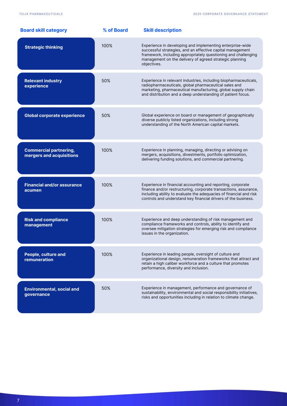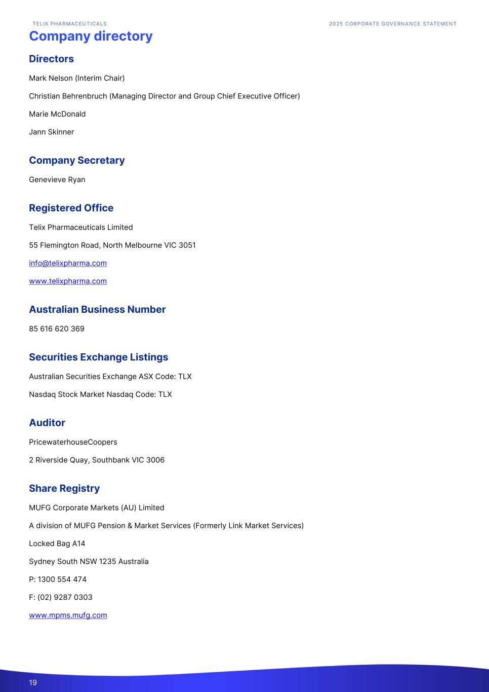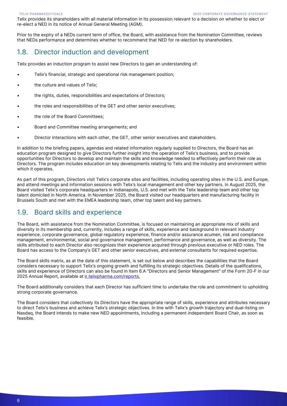 Telix provides its shareholders with all material information in its possession relevant to a decision on whether to elect or re-elect a NED in its notice of Annual General Meeting (AGM). Prior to the expiry of a NEDs current term of office, the Board, with assistance from the Nomination Committee, reviews that NEDs performance and determines whether to recommend that NED for re-election by shareholders. 1.8. Director induction and development Telix provides an induction program to assist new Directors to gain an understanding of: • Telix’s financial, strategic and operational risk management position; • the culture and values of Telix; • the rights, duties, responsibilities and expectations of Directors; • the roles and responsibilities of the GET and other senior executives; • the role of the Board Committees; • Board and Committee meeting arrangements; and • Director interactions with each other, the GET, other senior executives and stakeholders. In addition to the briefing papers, agendas and related information regularly supplied to Directors, the Board has an education program designed to give Directors further insight into the operation of Telix’s business, and to provide opportunities for Directors to develop and maintain the skills and knowledge needed to effectively perform their role as Directors. The program includes education on key developments relating to Telix and the industry and environment within which it operates. As part of this program, Directors visit Telix’s corporate sites and facilities, including operating sites in the U.S. and Europe, and attend meetings and information sessions with Telix’s local management and other key partners. In August 2025, the Board visited Telix’s corporate headquarters in Indianapolis, U.S. and met with the Telix leadership team and other top talent domiciled in North America. In November 2025, the Board visited our headquarters and manufacturing facility in Brussels South and met with the EMEA leadership team, other top talent and key partners. 1.9. Board skills and experience The Board, with assistance from the Nomination Committee, is focused on maintaining an appropriate mix of skills and diversity in its membership and, currently, includes a range of skills, experience and background in relevant industry experience, corporate governance, global regulatory experience, finance and/or assurance acumen, risk and compliance management, environmental, social and governance management, performance and governance, as well as diversity. The skills attributed to each Director also recognizes their experience acquired through previous executive or NED roles. The Board has access to the Company’s GET and other senior executives, and external consultants for required expertise. The Board skills matrix, as at the date of this statement, is set out below and describes the capabilities that the Board considers necessary to support Telix’s ongoing growth and fulfilling its strategic objectives. Details of the qualifications, skills and experience of Directors can also be found in Item 6.A "Directors and Senior Management" of the Form 20-F in our 2025 Annual Report, available at ir.telixpharma.com/reports. The Board additionally considers that each Director has sufficient time to undertake the role and commitment to upholding strong corporate governance. The Board considers that collectively its Directors have the appropriate range of skills, experience and attributes necessary to direct Telix’s business and achieve Telix’s strategic objectives. In line with Telix's growth trajectory and dual-listing on Nasdaq, the Board intends to make new NED appointments, including a permanent independent Board Chair, as soon as feasible. 6