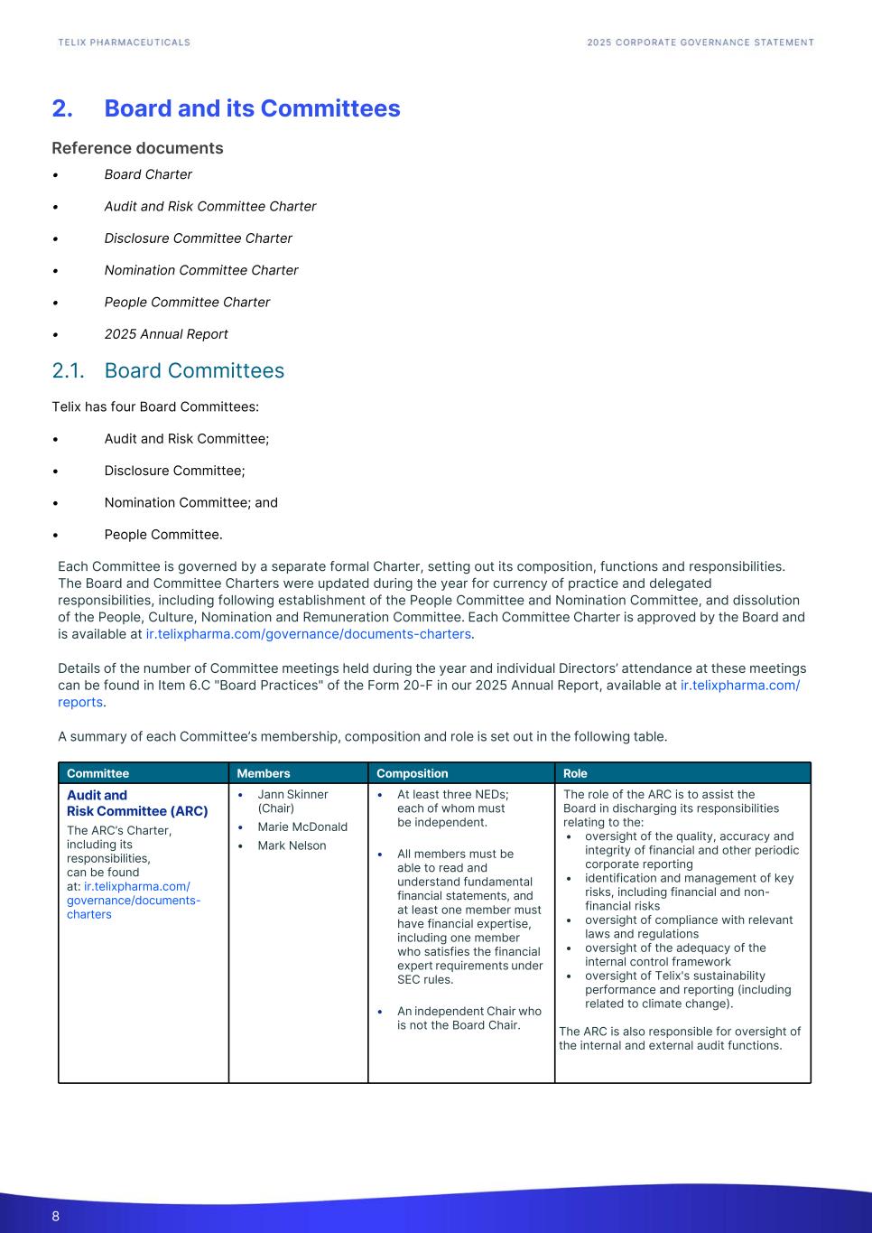 2. Board and its Committees Reference documents • Board Charter • Audit and Risk Committee Charter • Disclosure Committee Charter • Nomination Committee Charter • People Committee Charter • 2025 Annual Report 2.1. Board Committees Telix has four Board Committees: • Audit and Risk Committee; • Disclosure Committee; • Nomination Committee; and • People Committee. Each Committee is governed by a separate formal Charter, setting out its composition, functions and responsibilities. The Board and Committee Charters were updated during the year for currency of practice and delegated responsibilities, including following establishment of the People Committee and Nomination Committee, and dissolution of the People, Culture, Nomination and Remuneration Committee. Each Committee Charter is approved by the Board and is available at ir.telixpharma.com/governance/documents-charters. Details of the number of Committee meetings held during the year and individual Directors’ attendance at these meetings can be found in Item 6.C "Board Practices" of the Form 20-F in our 2025 Annual Report, available at ir.telixpharma.com/ reports. A summary of each Committee’s membership, composition and role is set out in the following table. Audit and Risk Committee (ARC) The ARC’s Charter, including its responsibilities, can be found at: ir.telixpharma.com/ governance/documents- charters • Jann Skinner (Chair) • Marie McDonald • Mark Nelson • At least three NEDs; each of whom must be independent. • All members must be able to read and understand fundamental financial statements, and at least one member must have financial expertise, including one member who satisfies the financial expert requirements under SEC rules. • An independent Chair who is not the Board Chair. The role of the ARC is to assist the Board in discharging its responsibilities relating to the: • oversight of the quality, accuracy and integrity of financial and other periodic corporate reporting • identification and management of key risks, including financial and non- financial risks • oversight of compliance with relevant laws and regulations • oversight of the adequacy of the internal control framework • oversight of Telix's sustainability performance and reporting (including related to climate change). The ARC is also responsible for oversight of the internal and external audit functions. Committee Members Composition Role 8