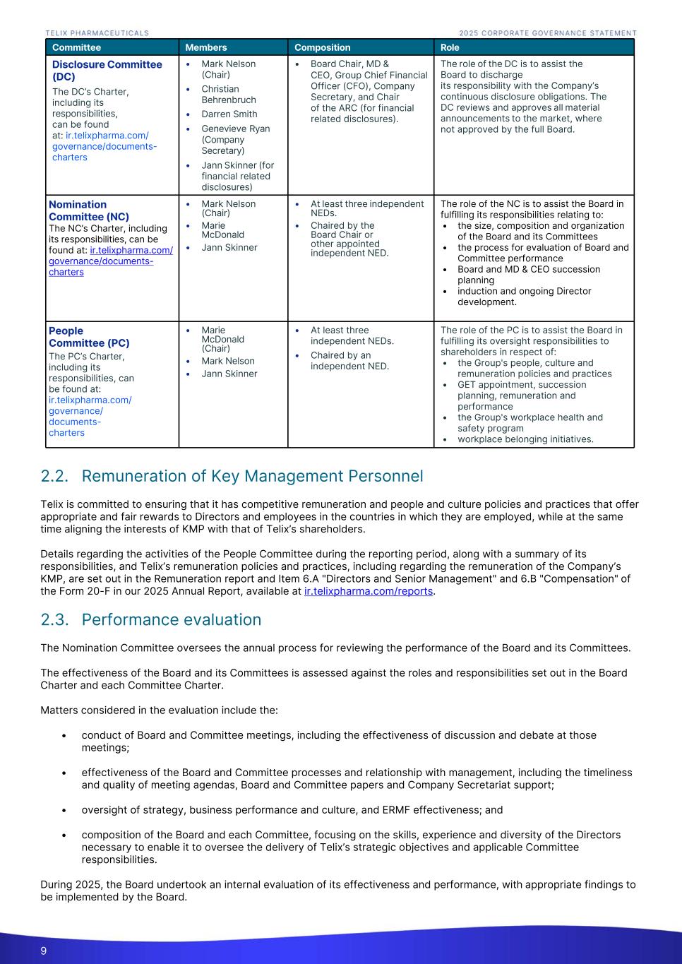 Disclosure Committee (DC) The DC’s Charter, including its responsibilities, can be found at: ir.telixpharma.com/ governance/documents- charters • Mark Nelson (Chair) • Christian Behrenbruch • Darren Smith • Genevieve Ryan (Company Secretary) • Jann Skinner (for financial related disclosures) • Board Chair, MD & CEO, Group Chief Financial Officer (CFO), Company Secretary, and Chair of the ARC (for financial related disclosures). The role of the DC is to assist the Board to discharge its responsibility with the Company’s continuous disclosure obligations. The DC reviews and approves all material announcements to the market, where not approved by the full Board. Nomination Committee (NC) The NC’s Charter, including its responsibilities, can be found at: ir.telixpharma.com/ governance/documents- charters • Mark Nelson (Chair) • Marie McDonald • Jann Skinner • At least three independent NEDs. • Chaired by the Board Chair or other appointed independent NED. The role of the NC is to assist the Board in fulfilling its responsibilities relating to: • the size, composition and organization of the Board and its Committees • the process for evaluation of Board and Committee performance • Board and MD & CEO succession planning • induction and ongoing Director development. People Committee (PC) The PC’s Charter, including its responsibilities, can be found at: ir.telixpharma.com/ governance/ documents- charters • Marie McDonald (Chair) • Mark Nelson • Jann Skinner • At least three independent NEDs. • Chaired by an independent NED. The role of the PC is to assist the Board in fulfilling its oversight responsibilities to shareholders in respect of: • the Group's people, culture and remuneration policies and practices • GET appointment, succession planning, remuneration and performance • the Group's workplace health and safety program • workplace belonging initiatives. Committee Members Composition Role 2.2. Remuneration of Key Management Personnel Telix is committed to ensuring that it has competitive remuneration and people and culture policies and practices that offer appropriate and fair rewards to Directors and employees in the countries in which they are employed, while at the same time aligning the interests of KMP with that of Telix’s shareholders. Details regarding the activities of the People Committee during the reporting period, along with a summary of its responsibilities, and Telix’s remuneration policies and practices, including regarding the remuneration of the Company’s KMP, are set out in the Remuneration report and Item 6.A "Directors and Senior Management" and 6.B "Compensation" of the Form 20-F in our 2025 Annual Report, available at ir.telixpharma.com/reports. 2.3. Performance evaluation The Nomination Committee oversees the annual process for reviewing the performance of the Board and its Committees. The effectiveness of the Board and its Committees is assessed against the roles and responsibilities set out in the Board Charter and each Committee Charter. Matters considered in the evaluation include the: • conduct of Board and Committee meetings, including the effectiveness of discussion and debate at those meetings; • effectiveness of the Board and Committee processes and relationship with management, including the timeliness and quality of meeting agendas, Board and Committee papers and Company Secretariat support; • oversight of strategy, business performance and culture, and ERMF effectiveness; and • composition of the Board and each Committee, focusing on the skills, experience and diversity of the Directors necessary to enable it to oversee the delivery of Telix’s strategic objectives and applicable Committee responsibilities. During 2025, the Board undertook an internal evaluation of its effectiveness and performance, with appropriate findings to be implemented by the Board. 9