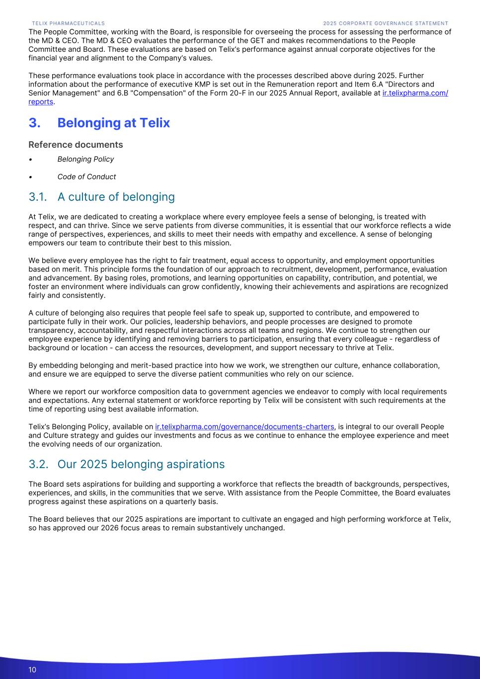 The People Committee, working with the Board, is responsible for overseeing the process for assessing the performance of the MD & CEO. The MD & CEO evaluates the performance of the GET and makes recommendations to the People Committee and Board. These evaluations are based on Telix’s performance against annual corporate objectives for the financial year and alignment to the Company’s values. These performance evaluations took place in accordance with the processes described above during 2025. Further information about the performance of executive KMP is set out in the Remuneration report and Item 6.A "Directors and Senior Management" and 6.B "Compensation" of the Form 20-F in our 2025 Annual Report, available at ir.telixpharma.com/ reports. 3. Belonging at Telix Reference documents • Belonging Policy • Code of Conduct 3.1. A culture of belonging At Telix, we are dedicated to creating a workplace where every employee feels a sense of belonging, is treated with respect, and can thrive. Since we serve patients from diverse communities, it is essential that our workforce reflects a wide range of perspectives, experiences, and skills to meet their needs with empathy and excellence. A sense of belonging empowers our team to contribute their best to this mission. We believe every employee has the right to fair treatment, equal access to opportunity, and employment opportunities based on merit. This principle forms the foundation of our approach to recruitment, development, performance, evaluation and advancement. By basing roles, promotions, and learning opportunities on capability, contribution, and potential, we foster an environment where individuals can grow confidently, knowing their achievements and aspirations are recognized fairly and consistently. A culture of belonging also requires that people feel safe to speak up, supported to contribute, and empowered to participate fully in their work. Our policies, leadership behaviors, and people processes are designed to promote transparency, accountability, and respectful interactions across all teams and regions. We continue to strengthen our employee experience by identifying and removing barriers to participation, ensuring that every colleague - regardless of background or location - can access the resources, development, and support necessary to thrive at Telix. By embedding belonging and merit-based practice into how we work, we strengthen our culture, enhance collaboration, and ensure we are equipped to serve the diverse patient communities who rely on our science. Where we report our workforce composition data to government agencies we endeavor to comply with local requirements and expectations. Any external statement or workforce reporting by Telix will be consistent with such requirements at the time of reporting using best available information. Telix’s Belonging Policy, available on ir.telixpharma.com/governance/documents-charters, is integral to our overall People and Culture strategy and guides our investments and focus as we continue to enhance the employee experience and meet the evolving needs of our organization. 3.2. Our 2025 belonging aspirations The Board sets aspirations for building and supporting a workforce that reflects the breadth of backgrounds, perspectives, experiences, and skills, in the communities that we serve. With assistance from the People Committee, the Board evaluates progress against these aspirations on a quarterly basis. The Board believes that our 2025 aspirations are important to cultivate an engaged and high performing workforce at Telix, so has approved our 2026 focus areas to remain substantively unchanged. 10