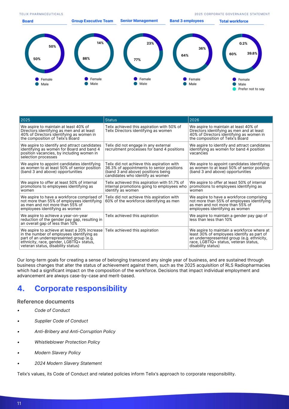 2025 Status 2026 We aspire to maintain at least 40% of Directors identifying as men and at least 40% of Directors identifying as women in the composition of Telix’s Board Telix achieved this aspiration with 50% of Telix Directors identifying as women We aspire to maintain at least 40% of Directors identifying as men and at least 40% of Directors identifying as women in the composition of Telix’s Board We aspire to identify and attract candidates identifying as women for Board and band 4 position vacancies, by including women in selection processes Telix did not engage in any external recruitment processes for band 4 positions We aspire to identify and attract candidates identifying as women for band 4 position vacancies We aspire to appoint candidates identifying as women to at least 50% of senior position (band 3 and above) opportunities Telix did not achieve this aspiration with 36.3% of appointments to senior positions (band 3 and above) positions being candidates who identify as women We aspire to appoint candidates identifying as women to at least 50% of senior position (band 3 and above) opportunities We aspire to offer at least 50% of internal promotions to employees identifying as women Telix achieved this aspiration with 51.7% of internal promotions going to employees who identify as women We aspire to offer at least 50% of internal promotions to employees identifying as women We aspire to have a workforce comprised of not more than 55% of employees identifying as men and not more than 55% of employees identifying as women Telix did not achieve this aspiration with 60% of the workforce identifying as men We aspire to have a workforce comprising not more than 55% of employees identifying as men and not more than 55% of employees identifying as women We aspire to achieve a year-on-year reduction of the gender pay gap, resulting in an overall gap of less than 10% Telix achieved this aspiration We aspire to maintain a gender pay gap of less than less than 10% We aspire to achieve at least a 20% increase in the number of employees identifying as part of an underrepresented group (e.g. ethnicity, race, gender, LGBTIQ+ status, veteran status, disability status) Telix achieved this aspiration We aspire to maintain a workforce where at least 30% of employees identify as part of an underrepresented group (e.g. ethnicity, race, LGBTIQ+ status, veteran status, disability status) Our long-term goals for creating a sense of belonging transcend any single year of business, and are sustained through business changes that alter the status of achievement against them, such as the 2025 acquisition of RLS Radiopharmacies which had a significant impact on the composition of the workforce. Decisions that impact individual employment and advancement are always case-by-case and merit-based. 4. Corporate responsibility Reference documents • Code of Conduct • Supplier Code of Conduct • Anti-Bribery and Anti-Corruption Policy • Whistleblower Protection Policy • Modern Slavery Policy • 2024 Modern Slavery Statement Telix’s values, its Code of Conduct and related policies inform Telix’s approach to corporate responsibility. 11