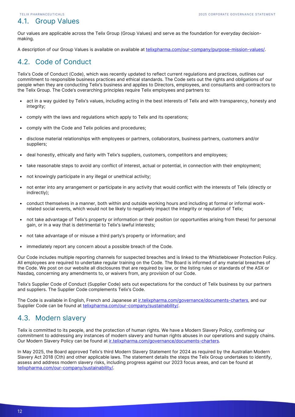 4.1. Group Values Our values are applicable across the Telix Group (Group Values) and serve as the foundation for everyday decision- making. A description of our Group Values is available on available at telixpharma.com/our-company/purpose-mission-values/. 4.2. Code of Conduct Telix’s Code of Conduct (Code), which was recently updated to reflect current regulations and practices, outlines our commitment to responsible business practices and ethical standards. The Code sets out the rights and obligations of our people when they are conducting Telix’s business and applies to Directors, employees, and consultants and contractors to the Telix Group. The Code’s overarching principles require Telix employees and partners to: • act in a way guided by Telix’s values, including acting in the best interests of Telix and with transparency, honesty and integrity; • comply with the laws and regulations which apply to Telix and its operations; • comply with the Code and Telix policies and procedures; • disclose material relationships with employees or partners, collaborators, business partners, customers and/or suppliers; • deal honestly, ethically and fairly with Telix’s suppliers, customers, competitors and employees; • take reasonable steps to avoid any conflict of interest, actual or potential, in connection with their employment; • not knowingly participate in any illegal or unethical activity; • not enter into any arrangement or participate in any activity that would conflict with the interests of Telix (directly or indirectly); • conduct themselves in a manner, both within and outside working hours and including at formal or informal work- related social events, which would not be likely to negatively impact the integrity or reputation of Telix; • not take advantage of Telix’s property or information or their position (or opportunities arising from these) for personal gain, or in a way that is detrimental to Telix's lawful interests; • not take advantage of or misuse a third party’s property or information; and • immediately report any concern about a possible breach of the Code. Our Code includes multiple reporting channels for suspected breaches and is linked to the Whistleblower Protection Policy. All employees are required to undertake regular training on the Code. The Board is informed of any material breaches of the Code. We post on our website all disclosures that are required by law, or the listing rules or standards of the ASX or Nasdaq, concerning any amendments to, or waivers from, any provision of our Code. Telix’s Supplier Code of Conduct (Supplier Code) sets out expectations for the conduct of Telix business by our partners and suppliers. The Supplier Code complements Telix’s Code. The Code is available in English, French and Japanese at ir.telixpharma.com/governance/documents-charters, and our Supplier Code can be found at telixpharma.com/our-company/sustainability/. 4.3. Modern slavery Telix is committed to its people, and the protection of human rights. We have a Modern Slavery Policy, confirming our commitment to addressing any instances of modern slavery and human rights abuses in our operations and supply chains. Our Modern Slavery Policy can be found at ir.telixpharma.com/governance/documents-charters. In May 2025, the Board approved Telix’s third Modern Slavery Statement for 2024 as required by the Australian Modern Slavery Act 2018 (Cth) and other applicable laws. The statement details the steps the Telix Group undertakes to identify, assess and address modern slavery risks, including progress against our 2023 focus areas, and can be found at telixpharma.com/our-company/sustainability/. 12