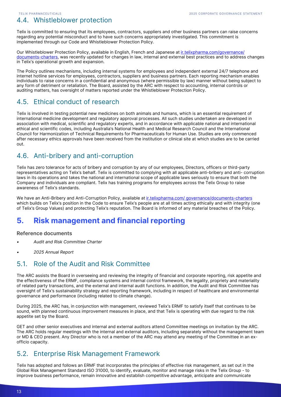 4.4. Whistleblower protection Telix is committed to ensuring that its employees, contractors, suppliers and other business partners can raise concerns regarding any potential misconduct and to have such concerns appropriately investigated. This commitment is implemented through our Code and Whistleblower Protection Policy. Our Whistleblower Protection Policy, available in English, French and Japanese at ir.telixpharma.com/governance/ documents-charters, was recently updated for changes in law, internal and external best practices and to address changes in Telix’s operational growth and expansion. The Policy outlines mechanisms, including internal systems for employees and independent external 24/7 telephone and internet hotline services for employees, contractors, suppliers and business partners. Each reporting mechanism enables individuals to raise concerns in a confidential and anonymous (where permissible by law) manner without being subject to any form of detriment or retaliation. The Board, assisted by the ARC with respect to accounting, internal controls or auditing matters, has oversight of matters reported under the Whistleblower Protection Policy. 4.5. Ethical conduct of research Telix is involved in testing potential new medicines on both animals and humans, which is an essential requirement of international medicine development and regulatory approval processes. All such studies undertaken are developed in association with medical, scientific and regulatory experts, and in accordance with applicable national and international ethical and scientific codes, including Australia’s National Health and Medical Research Council and the International Council for Harmonization of Technical Requirements for Pharmaceuticals for Human Use. Studies are only commenced after necessary ethics approvals have been received from the institution or clinical site at which studies are to be carried out. 4.6. Anti-bribery and anti-corruption Telix has zero tolerance for acts of bribery and corruption by any of our employees, Directors, officers or third-party representatives acting on Telix’s behalf. Telix is committed to complying with all applicable anti-bribery and anti- corruption laws in its operations and takes the national and international scope of applicable laws seriously to ensure that both the Company and individuals are compliant. Telix has training programs for employees across the Telix Group to raise awareness of Telix’s standards. We have an Anti-Bribery and Anti-Corruption Policy, available at ir.telixpharma.com/ governance/documents-charters which builds on Telix’s position in the Code to ensure Telix’s people are at all times acting ethically and with integrity (one of Telix’s Group Values) and protecting Telix’s reputation. The Board is informed of any material breaches of the Policy. 5. Risk management and financial reporting Reference documents • Audit and Risk Committee Charter • 2025 Annual Report 5.1. Role of the Audit and Risk Committee The ARC assists the Board in overseeing and reviewing the integrity of financial and corporate reporting, risk appetite and the effectiveness of the ERMF, compliance systems and internal control framework, the legality, propriety and materiality of related party transactions, and the external and internal audit functions. In addition, the Audit and Risk Committee has oversight of Telix’s sustainability strategy and reporting framework, including in respect of healthcare and environmental governance and performance (including related to climate change). During 2025, the ARC has, in conjunction with management, reviewed Telix’s ERMF to satisfy itself that continues to be sound, with planned continuous improvement measures in place, and that Telix is operating with due regard to the risk appetite set by the Board. GET and other senior executives and internal and external auditors attend Committee meetings on invitation by the ARC. The ARC holds regular meetings with the internal and external auditors, including separately without the management team or MD & CEO present. Any Director who is not a member of the ARC may attend any meeting of the Committee in an ex- officio capacity. 5.2. Enterprise Risk Management Framework Telix has adopted and follows an ERMF that incorporates the principles of effective risk management, as set out in the Global Risk Management Standard ISO 31000, to identify, evaluate, monitor and manage risks in the Telix Group - to improve business performance, remain innovative and establish competitive advantage, anticipate and communicate 13
