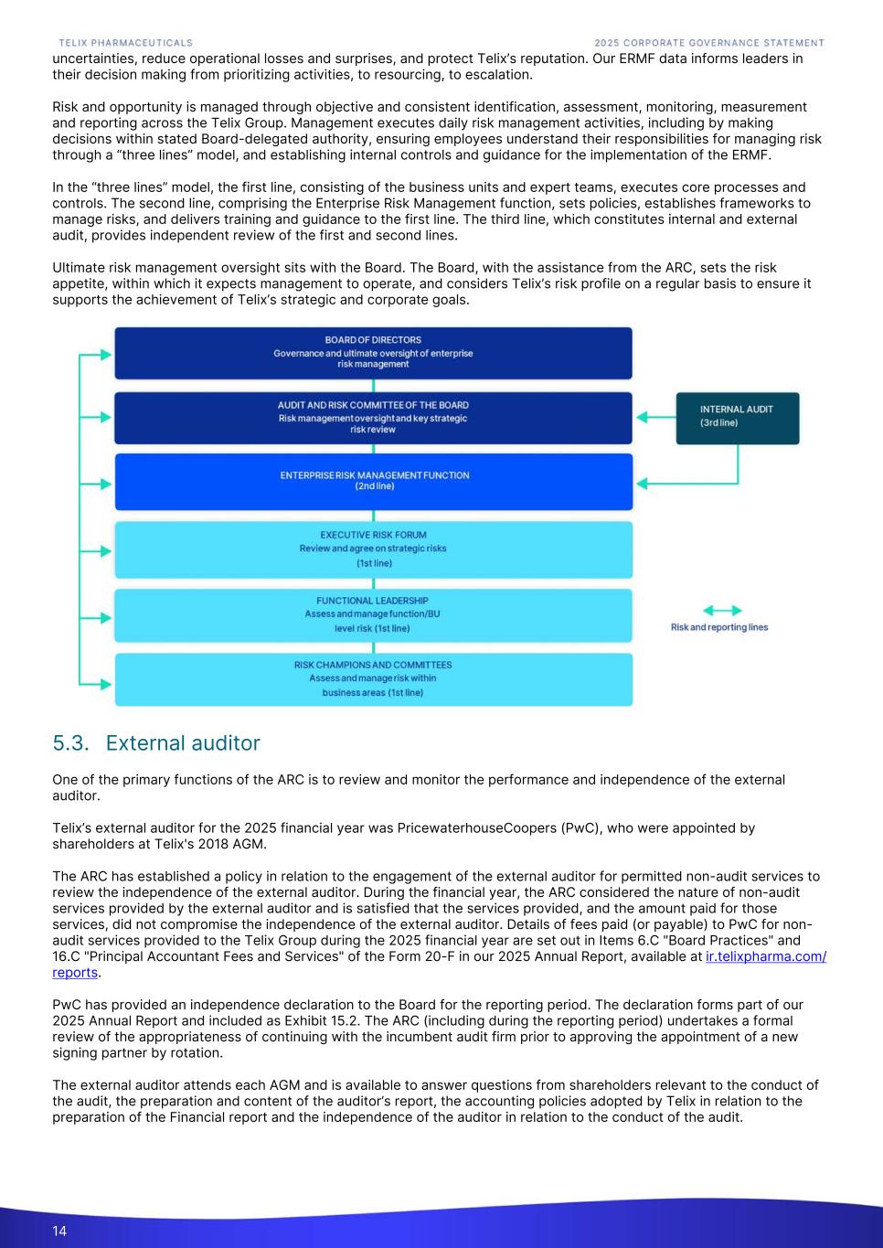 uncertainties, reduce operational losses and surprises, and protect Telix’s reputation. Our ERMF data informs leaders in their decision making from prioritizing activities, to resourcing, to escalation. Risk and opportunity is managed through objective and consistent identification, assessment, monitoring, measurement and reporting across the Telix Group. Management executes daily risk management activities, including by making decisions within stated Board-delegated authority, ensuring employees understand their responsibilities for managing risk through a “three lines” model, and establishing internal controls and guidance for the implementation of the ERMF. In the “three lines” model, the first line, consisting of the business units and expert teams, executes core processes and controls. The second line, comprising the Enterprise Risk Management function, sets policies, establishes frameworks to manage risks, and delivers training and guidance to the first line. The third line, which constitutes internal and external audit, provides independent review of the first and second lines. Ultimate risk management oversight sits with the Board. The Board, with the assistance from the ARC, sets the risk appetite, within which it expects management to operate, and considers Telix’s risk profile on a regular basis to ensure it supports the achievement of Telix’s strategic and corporate goals. 5.3. External auditor One of the primary functions of the ARC is to review and monitor the performance and independence of the external auditor. Telix’s external auditor for the 2025 financial year was PricewaterhouseCoopers (PwC), who were appointed by shareholders at Telix's 2018 AGM. The ARC has established a policy in relation to the engagement of the external auditor for permitted non-audit services to review the independence of the external auditor. During the financial year, the ARC considered the nature of non-audit services provided by the external auditor and is satisfied that the services provided, and the amount paid for those services, did not compromise the independence of the external auditor. Details of fees paid (or payable) to PwC for non- audit services provided to the Telix Group during the 2025 financial year are set out in Items 6.C "Board Practices" and 16.C "Principal Accountant Fees and Services" of the Form 20-F in our 2025 Annual Report, available at ir.telixpharma.com/ reports. PwC has provided an independence declaration to the Board for the reporting period. The declaration forms part of our 2025 Annual Report and included as Exhibit 15.2. The ARC (including during the reporting period) undertakes a formal review of the appropriateness of continuing with the incumbent audit firm prior to approving the appointment of a new signing partner by rotation. The external auditor attends each AGM and is available to answer questions from shareholders relevant to the conduct of the audit, the preparation and content of the auditor’s report, the accounting policies adopted by Telix in relation to the preparation of the Financial report and the independence of the auditor in relation to the conduct of the audit. 14