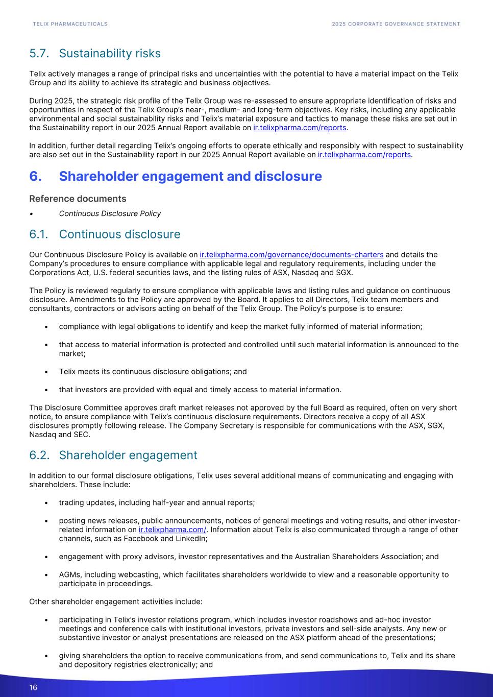 5.7. Sustainability risks Telix actively manages a range of principal risks and uncertainties with the potential to have a material impact on the Telix Group and its ability to achieve its strategic and business objectives. During 2025, the strategic risk profile of the Telix Group was re-assessed to ensure appropriate identification of risks and opportunities in respect of the Telix Group’s near-, medium- and long-term objectives. Key risks, including any applicable environmental and social sustainability risks and Telix’s material exposure and tactics to manage these risks are set out in the Sustainability report in our 2025 Annual Report available on ir.telixpharma.com/reports. In addition, further detail regarding Telix’s ongoing efforts to operate ethically and responsibly with respect to sustainability are also set out in the Sustainability report in our 2025 Annual Report available on ir.telixpharma.com/reports. 6. Shareholder engagement and disclosure Reference documents • Continuous Disclosure Policy 6.1. Continuous disclosure Our Continuous Disclosure Policy is available on ir.telixpharma.com/governance/documents-charters and details the Company’s procedures to ensure compliance with applicable legal and regulatory requirements, including under the Corporations Act, U.S. federal securities laws, and the listing rules of ASX, Nasdaq and SGX. The Policy is reviewed regularly to ensure compliance with applicable laws and listing rules and guidance on continuous disclosure. Amendments to the Policy are approved by the Board. It applies to all Directors, Telix team members and consultants, contractors or advisors acting on behalf of the Telix Group. The Policy’s purpose is to ensure: • compliance with legal obligations to identify and keep the market fully informed of material information; • that access to material information is protected and controlled until such material information is announced to the market; • Telix meets its continuous disclosure obligations; and • that investors are provided with equal and timely access to material information. The Disclosure Committee approves draft market releases not approved by the full Board as required, often on very short notice, to ensure compliance with Telix’s continuous disclosure requirements. Directors receive a copy of all ASX disclosures promptly following release. The Company Secretary is responsible for communications with the ASX, SGX, Nasdaq and SEC. 6.2. Shareholder engagement In addition to our formal disclosure obligations, Telix uses several additional means of communicating and engaging with shareholders. These include: • trading updates, including half-year and annual reports; • posting news releases, public announcements, notices of general meetings and voting results, and other investor- related information on ir.telixpharma.com/. Information about Telix is also communicated through a range of other channels, such as Facebook and LinkedIn; • engagement with proxy advisors, investor representatives and the Australian Shareholders Association; and • AGMs, including webcasting, which facilitates shareholders worldwide to view and a reasonable opportunity to participate in proceedings. Other shareholder engagement activities include: • participating in Telix’s investor relations program, which includes investor roadshows and ad-hoc investor meetings and conference calls with institutional investors, private investors and sell-side analysts. Any new or substantive investor or analyst presentations are released on the ASX platform ahead of the presentations; • giving shareholders the option to receive communications from, and send communications to, Telix and its share and depository registries electronically; and 16