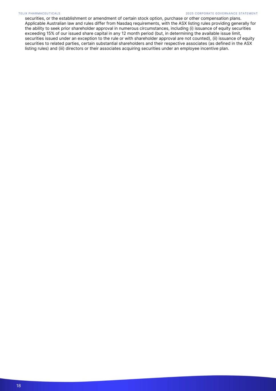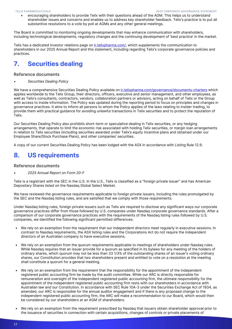 • encouraging shareholders to provide Telix with their questions ahead of the AGM. This helps us to understand shareholder issues and concerns and enables us to address key shareholder feedback. Telix’s practice is to put all substantive resolutions to a vote by poll at AGMs and any other general meetings. The Board is committed to monitoring ongoing developments that may enhance communication with shareholders, including technological developments, regulatory changes and the continuing development of ‘best practice’ in the market. Telix has a dedicated investor relations page on ir.telixpharma.com/, which supplements the communication to shareholders in our 2025 Annual Report and this statement, including regarding Telix’s corporate governance policies and practices. 7. Securities dealing Reference documents • Securities Dealing Policy We have a comprehensive Securities Dealing Policy available on ir.telixpharma.com/governance/documents-charters which applies worldwide to the Telix Group, their directors, officers, executive and senior management, and other employees, as well as Telix’s consultants, contractors, vendors, collaboration partners or advisors, acting on behalf of Telix or the Group with access to inside information. The Policy was updated during the reporting period to focus on principles and changes in governance practices. It aims to inform all persons to whom the Policy applies of the laws relating to insider trading, to provide them with practical guidance for avoiding unlawful transactions in Telix securities and to protect the reputation of Telix. Our Securities Dealing Policy also prohibits short-term or speculative dealing in Telix securities, or any hedging arrangements, that operate to limit the economic risk associated with holding Telix securities, or margin loan arrangements in relation to Telix securities (including securities awarded under Telix’s equity incentive plans and obtained under our Employee Share/Stock Purchase Plans), and other companies’ securities. A copy of our current Securities Dealing Policy has been lodged with the ASX in accordance with Listing Rule 12.9. 8. US requirements Reference documents • 2025 Annual Report on Form 20-F Telix is a registrant with the SEC in the U.S. In the U.S., Telix is classified as a “foreign private issuer” and has American Depositary Shares listed on the Nasdaq Global Select Market. We have reviewed the governance requirements applicable to foreign private issuers, including the rules promulgated by the SEC and the Nasdaq listing rules, and are satisfied that we comply with those requirements. Under Nasdaq listing rules, foreign private issuers such as Telix are required to disclose any significant ways our corporate governance practices differ from those followed by U.S. companies under Nasdaq corporate governance standards. After a comparison of our corporate governance practices with the requirements of the Nasdaq listing rules followed by U.S. companies, we identified the following significant permitted differences: • We rely on an exemption from the requirement that our independent directors meet regularly in executive sessions. In contrast to Nasdaq requirements, the ASX listing rules and the Corporations Act do not require the independent directors of an Australian company to have executive sessions. • We rely on an exemption from the quorum requirements applicable to meetings of shareholders under Nasdaq rules. While Nasdaq requires that an issuer provide for a quorum as specified in its bylaws for any meeting of the holders of ordinary shares, which quorum may not be less than 33 1/3% of the outstanding shares of an issuer’s voting ordinary shares, our Constitution provides that two shareholders present and entitled to vote on a resolution at the meeting shall constitute a quorum for a general meeting. • We rely on an exemption from the requirement that the responsibility for the appointment of the independent registered public accounting firm be made by the audit committee. While our ARC is directly responsible for remuneration and oversight of the independent registered public accounting firm, the ultimate responsibility for the appointment of the independent registered public accounting firm rests with our shareholders in accordance with Australian law and our Constitution. In accordance with SEC Rule 10A-3 under the Securities Exchange Act of 1934, as amended, our ARC is responsible for the annual auditor engagement and if there is any proposed change to the independent registered public accounting firm, the ARC will make a recommendation to our Board, which would then be considered by our shareholders at an AGM of shareholders. • We rely on an exemption from the requirement prescribed by Nasdaq that issuers obtain shareholder approval prior to the issuance of securities in connection with certain acquisitions, changes of controls or private placements of 17