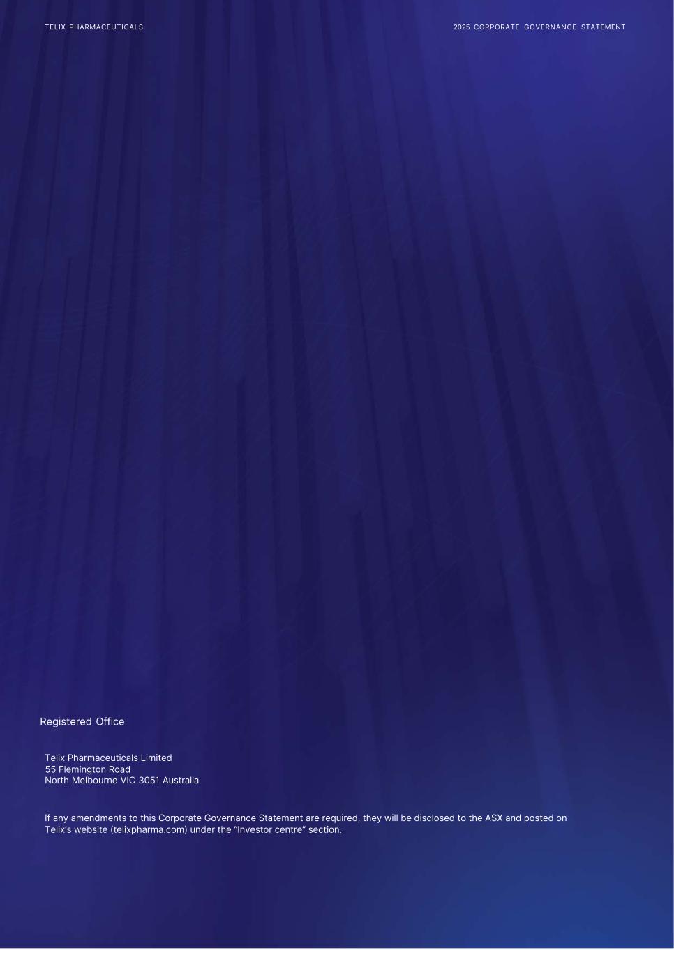 TELIX PHARMACEUTICALS 2025 CORPORATE GOVERNANCE STATEMENT Registered Office Telix Pharmaceuticals Limited 55 Flemington Road North Melbourne VIC 3051 Australia If any amendments to this Corporate Governance Statement are required, they will be disclosed to the ASX and posted on Telix’s website (telixpharma.com) under the “Investor centre” section.