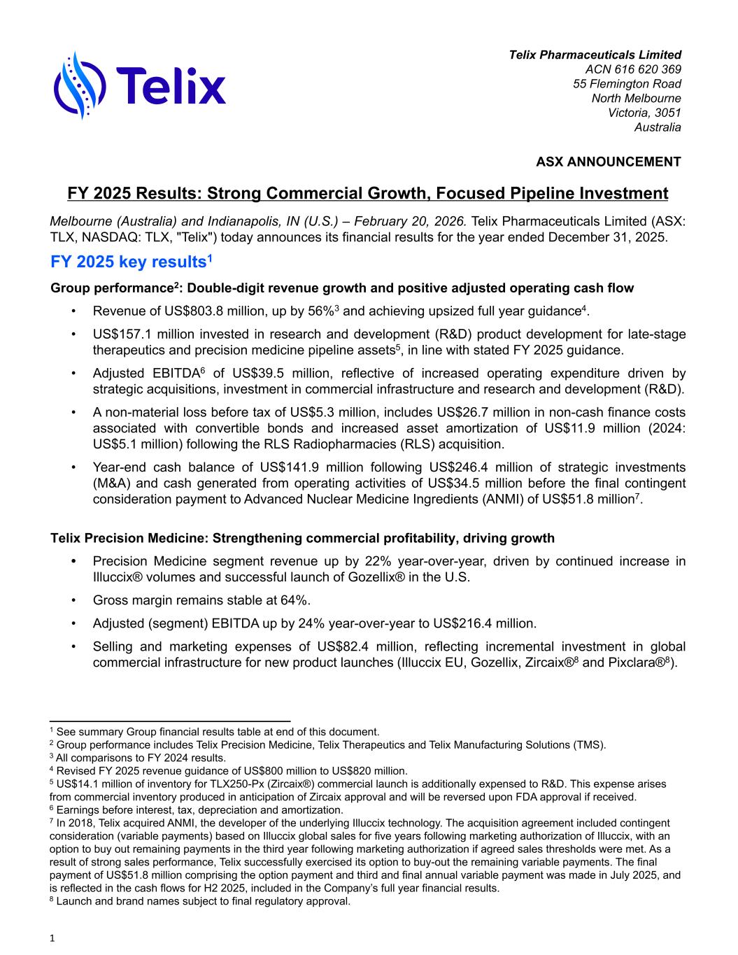 Telix Pharmaceuticals Limited ACN 616 620 369 55 Flemington Road North Melbourne Victoria, 3051 Australia ASX ANNOUNCEMENT FY 2025 Results: Strong Commercial Growth, Focused Pipeline Investment Melbourne (Australia) and Indianapolis, IN (U.S.) – February 20, 2026. Telix Pharmaceuticals Limited (ASX: TLX, NASDAQ: TLX, "Telix") today announces its financial results for the year ended December 31, 2025. FY 2025 key results1 Group performance2: Double-digit revenue growth and positive adjusted operating cash flow • Revenue of US$803.8 million, up by 56%3 and achieving upsized full year guidance4. • US$157.1 million invested in research and development (R&D) product development for late-stage therapeutics and precision medicine pipeline assets5, in line with stated FY 2025 guidance. • Adjusted EBITDA6 of US$39.5 million, reflective of increased operating expenditure driven by strategic acquisitions, investment in commercial infrastructure and research and development (R&D). • A non-material loss before tax of US$5.3 million, includes US$26.7 million in non-cash finance costs associated with convertible bonds and increased asset amortization of US$11.9 million (2024: US$5.1 million) following the RLS Radiopharmacies (RLS) acquisition. • Year-end cash balance of US$141.9 million following US$246.4 million of strategic investments (M&A) and cash generated from operating activities of US$34.5 million before the final contingent consideration payment to Advanced Nuclear Medicine Ingredients (ANMI) of US$51.8 million7. Telix Precision Medicine: Strengthening commercial profitability, driving growth • Precision Medicine segment revenue up by 22% year-over-year, driven by continued increase in Illuccix® volumes and successful launch of Gozellix® in the U.S. • Gross margin remains stable at 64%. • Adjusted (segment) EBITDA up by 24% year-over-year to US$216.4 million. • Selling and marketing expenses of US$82.4 million, reflecting incremental investment in global commercial infrastructure for new product launches (Illuccix EU, Gozellix, Zircaix®8 and Pixclara®8). 1 1 See summary Group financial results table at end of this document. 2 Group performance includes Telix Precision Medicine, Telix Therapeutics and Telix Manufacturing Solutions (TMS). 3 All comparisons to FY 2024 results. 4 Revised FY 2025 revenue guidance of US$800 million to US$820 million. 5 US$14.1 million of inventory for TLX250-Px (Zircaix®) commercial launch is additionally expensed to R&D. This expense arises from commercial inventory produced in anticipation of Zircaix approval and will be reversed upon FDA approval if received. 6 Earnings before interest, tax, depreciation and amortization. 7 In 2018, Telix acquired ANMI, the developer of the underlying Illuccix technology. The acquisition agreement included contingent consideration (variable payments) based on Illuccix global sales for five years following marketing authorization of Illuccix, with an option to buy out remaining payments in the third year following marketing authorization if agreed sales thresholds were met. As a result of strong sales performance, Telix successfully exercised its option to buy-out the remaining variable payments. The final payment of US$51.8 million comprising the option payment and third and final annual variable payment was made in July 2025, and is reflected in the cash flows for H2 2025, included in the Company’s full year financial results. 8 Launch and brand names subject to final regulatory approval.