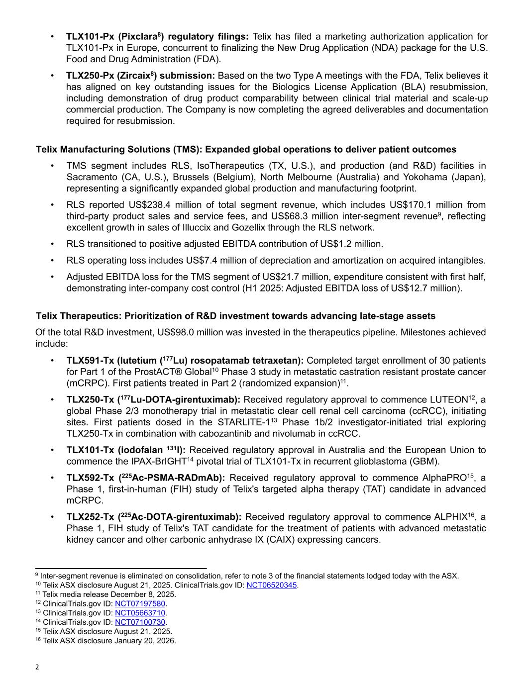• TLX101-Px (Pixclara8) regulatory filings: Telix has filed a marketing authorization application for TLX101-Px in Europe, concurrent to finalizing the New Drug Application (NDA) package for the U.S. Food and Drug Administration (FDA). • TLX250-Px (Zircaix8) submission: Based on the two Type A meetings with the FDA, Telix believes it has aligned on key outstanding issues for the Biologics License Application (BLA) resubmission, including demonstration of drug product comparability between clinical trial material and scale-up commercial production. The Company is now completing the agreed deliverables and documentation required for resubmission. Telix Manufacturing Solutions (TMS): Expanded global operations to deliver patient outcomes • TMS segment includes RLS, IsoTherapeutics (TX, U.S.), and production (and R&D) facilities in Sacramento (CA, U.S.), Brussels (Belgium), North Melbourne (Australia) and Yokohama (Japan), representing a significantly expanded global production and manufacturing footprint. • RLS reported US$238.4 million of total segment revenue, which includes US$170.1 million from third-party product sales and service fees, and US$68.3 million inter-segment revenue9, reflecting excellent growth in sales of Illuccix and Gozellix through the RLS network. • RLS transitioned to positive adjusted EBITDA contribution of US$1.2 million. • RLS operating loss includes US$7.4 million of depreciation and amortization on acquired intangibles. • Adjusted EBITDA loss for the TMS segment of US$21.7 million, expenditure consistent with first half, demonstrating inter-company cost control (H1 2025: Adjusted EBITDA loss of US$12.7 million). Telix Therapeutics: Prioritization of R&D investment towards advancing late-stage assets Of the total R&D investment, US$98.0 million was invested in the therapeutics pipeline. Milestones achieved include: • TLX591-Tx (lutetium (177Lu) rosopatamab tetraxetan): Completed target enrollment of 30 patients for Part 1 of the ProstACT® Global10 Phase 3 study in metastatic castration resistant prostate cancer (mCRPC). First patients treated in Part 2 (randomized expansion)11. • TLX250-Tx (177Lu-DOTA-girentuximab): Received regulatory approval to commence LUTEON12, a global Phase 2/3 monotherapy trial in metastatic clear cell renal cell carcinoma (ccRCC), initiating sites. First patients dosed in the STARLITE-113 Phase 1b/2 investigator-initiated trial exploring TLX250-Tx in combination with cabozantinib and nivolumab in ccRCC. • TLX101-Tx (iodofalan 131I): Received regulatory approval in Australia and the European Union to commence the IPAX-BrIGHT14 pivotal trial of TLX101-Tx in recurrent glioblastoma (GBM). • TLX592-Tx (225Ac-PSMA-RADmAb): Received regulatory approval to commence AlphaPRO15, a Phase 1, first-in-human (FIH) study of Telix's targeted alpha therapy (TAT) candidate in advanced mCRPC. • TLX252-Tx (225Ac-DOTA-girentuximab): Received regulatory approval to commence ALPHIX16, a Phase 1, FIH study of Telix's TAT candidate for the treatment of patients with advanced metastatic kidney cancer and other carbonic anhydrase IX (CAIX) expressing cancers. 2 9 Inter-segment revenue is eliminated on consolidation, refer to note 3 of the financial statements lodged today with the ASX. 10 Telix ASX disclosure August 21, 2025. ClinicalTrials.gov ID: NCT06520345. 11 Telix media release December 8, 2025. 12 ClinicalTrials.gov ID: NCT07197580. 13 ClinicalTrials.gov ID: NCT05663710. 14 ClinicalTrials.gov ID: NCT07100730. 15 Telix ASX disclosure August 21, 2025. 16 Telix ASX disclosure January 20, 2026.