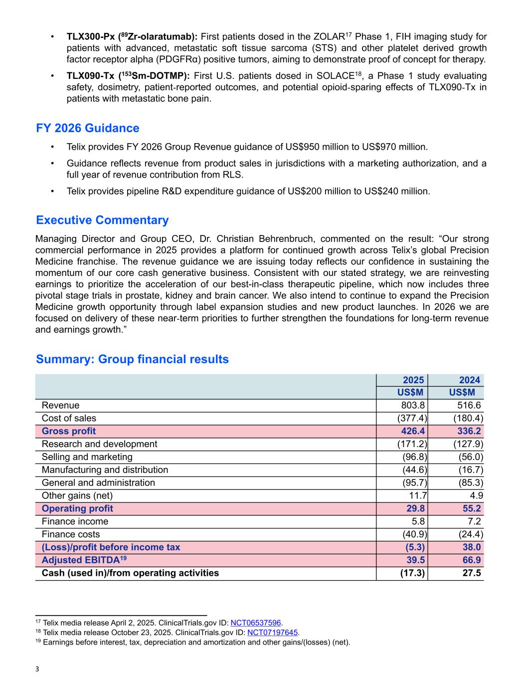 • TLX300-Px (89Zr-olaratumab): First patients dosed in the ZOLAR17 Phase 1, FIH imaging study for patients with advanced, metastatic soft tissue sarcoma (STS) and other platelet derived growth factor receptor alpha (PDGFRα) positive tumors, aiming to demonstrate proof of concept for therapy. • TLX090-Tx (153Sm-DOTMP): First U.S. patients dosed in SOLACE18, a Phase 1 study evaluating safety, dosimetry, patient-reported outcomes, and potential opioid-sparing effects of TLX090-Tx in patients with metastatic bone pain. FY 2026 Guidance • Telix provides FY 2026 Group Revenue guidance of US$950 million to US$970 million. • Guidance reflects revenue from product sales in jurisdictions with a marketing authorization, and a full year of revenue contribution from RLS. • Telix provides pipeline R&D expenditure guidance of US$200 million to US$240 million. Executive Commentary Managing Director and Group CEO, Dr. Christian Behrenbruch, commented on the result: “Our strong commercial performance in 2025 provides a platform for continued growth across Telix’s global Precision Medicine franchise. The revenue guidance we are issuing today reflects our confidence in sustaining the momentum of our core cash generative business. Consistent with our stated strategy, we are reinvesting earnings to prioritize the acceleration of our best-in-class therapeutic pipeline, which now includes three pivotal stage trials in prostate, kidney and brain cancer. We also intend to continue to expand the Precision Medicine growth opportunity through label expansion studies and new product launches. In 2026 we are focused on delivery of these near-term priorities to further strengthen the foundations for long-term revenue and earnings growth.” Summary: Group financial results 2025 2024 US$M US$M Revenue 803.8 516.6 Cost of sales (377.4) (180.4) Gross profit 426.4 336.2 Research and development (171.2) (127.9) Selling and marketing (96.8) (56.0) Manufacturing and distribution (44.6) (16.7) General and administration (95.7) (85.3) Other gains (net) 11.7 4.9 Operating profit 29.8 55.2 Finance income 5.8 7.2 Finance costs (40.9) (24.4) (Loss)/profit before income tax (5.3) 38.0 Adjusted EBITDA19 39.5 66.9 Cash (used in)/from operating activities (17.3) 27.5 3 17 Telix media release April 2, 2025. ClinicalTrials.gov ID: NCT06537596. 18 Telix media release October 23, 2025. ClinicalTrials.gov ID: NCT07197645. 19 Earnings before interest, tax, depreciation and amortization and other gains/(losses) (net).