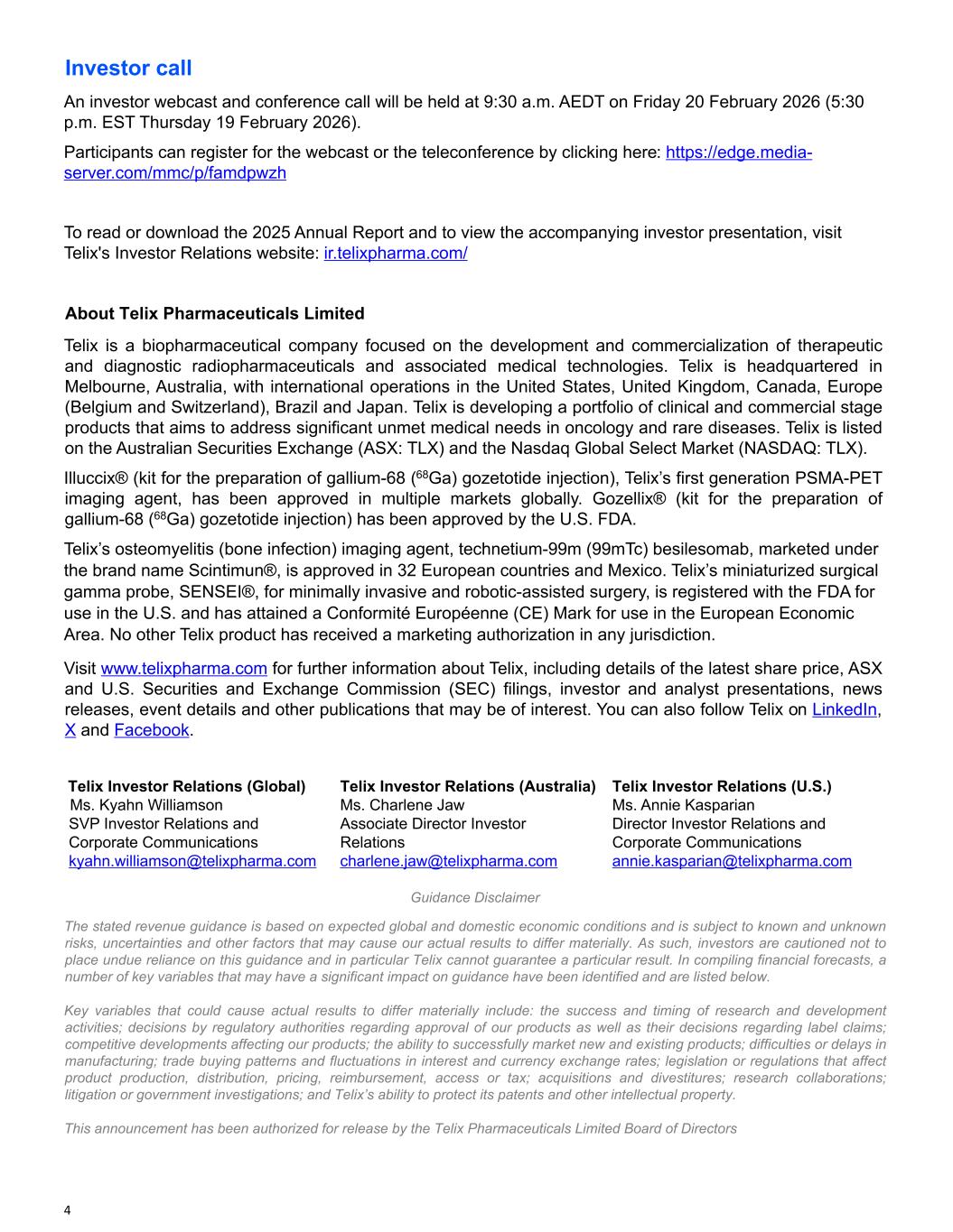 Investor call An investor webcast and conference call will be held at 9:30 a.m. AEDT on Friday 20 February 2026 (5:30 p.m. EST Thursday 19 February 2026). Participants can register for the webcast or the teleconference by clicking here: https://edge.media- server.com/mmc/p/famdpwzh To read or download the 2025 Annual Report and to view the accompanying investor presentation, visit Telix's Investor Relations website: ir.telixpharma.com/ About Telix Pharmaceuticals Limited Telix is a biopharmaceutical company focused on the development and commercialization of therapeutic and diagnostic radiopharmaceuticals and associated medical technologies. Telix is headquartered in Melbourne, Australia, with international operations in the United States, United Kingdom, Canada, Europe (Belgium and Switzerland), Brazil and Japan. Telix is developing a portfolio of clinical and commercial stage products that aims to address significant unmet medical needs in oncology and rare diseases. Telix is listed on the Australian Securities Exchange (ASX: TLX) and the Nasdaq Global Select Market (NASDAQ: TLX). Illuccix® (kit for the preparation of gallium-68 (68Ga) gozetotide injection), Telix’s first generation PSMA-PET imaging agent, has been approved in multiple markets globally. Gozellix® (kit for the preparation of gallium-68 (68Ga) gozetotide injection) has been approved by the U.S. FDA. Telix’s osteomyelitis (bone infection) imaging agent, technetium-99m (99mTc) besilesomab, marketed under the brand name Scintimun®, is approved in 32 European countries and Mexico. Telix’s miniaturized surgical gamma probe, SENSEI®, for minimally invasive and robotic-assisted surgery, is registered with the FDA for use in the U.S. and has attained a Conformité Européenne (CE) Mark for use in the European Economic Area. No other Telix product has received a marketing authorization in any jurisdiction. Visit www.telixpharma.com for further information about Telix, including details of the latest share price, ASX and U.S. Securities and Exchange Commission (SEC) filings, investor and analyst presentations, news releases, event details and other publications that may be of interest. You can also follow Telix on LinkedIn, X and Facebook. Telix Investor Relations (Global) Ms. Kyahn Williamson SVP Investor Relations and Corporate Communications kyahn.williamson@telixpharma.com Telix Investor Relations (Australia) Ms. Charlene Jaw Associate Director Investor Relations charlene.jaw@telixpharma.com Telix Investor Relations (U.S.) Ms. Annie Kasparian Director Investor Relations and Corporate Communications annie.kasparian@telixpharma.com Guidance Disclaimer The stated revenue guidance is based on expected global and domestic economic conditions and is subject to known and unknown risks, uncertainties and other factors that may cause our actual results to differ materially. As such, investors are cautioned not to place undue reliance on this guidance and in particular Telix cannot guarantee a particular result. In compiling financial forecasts, a number of key variables that may have a significant impact on guidance have been identified and are listed below. Key variables that could cause actual results to differ materially include: the success and timing of research and development activities; decisions by regulatory authorities regarding approval of our products as well as their decisions regarding label claims; competitive developments affecting our products; the ability to successfully market new and existing products; difficulties or delays in manufacturing; trade buying patterns and fluctuations in interest and currency exchange rates; legislation or regulations that affect product production, distribution, pricing, reimbursement, access or tax; acquisitions and divestitures; research collaborations; litigation or government investigations; and Telix’s ability to protect its patents and other intellectual property. This announcement has been authorized for release by the Telix Pharmaceuticals Limited Board of Directors 4