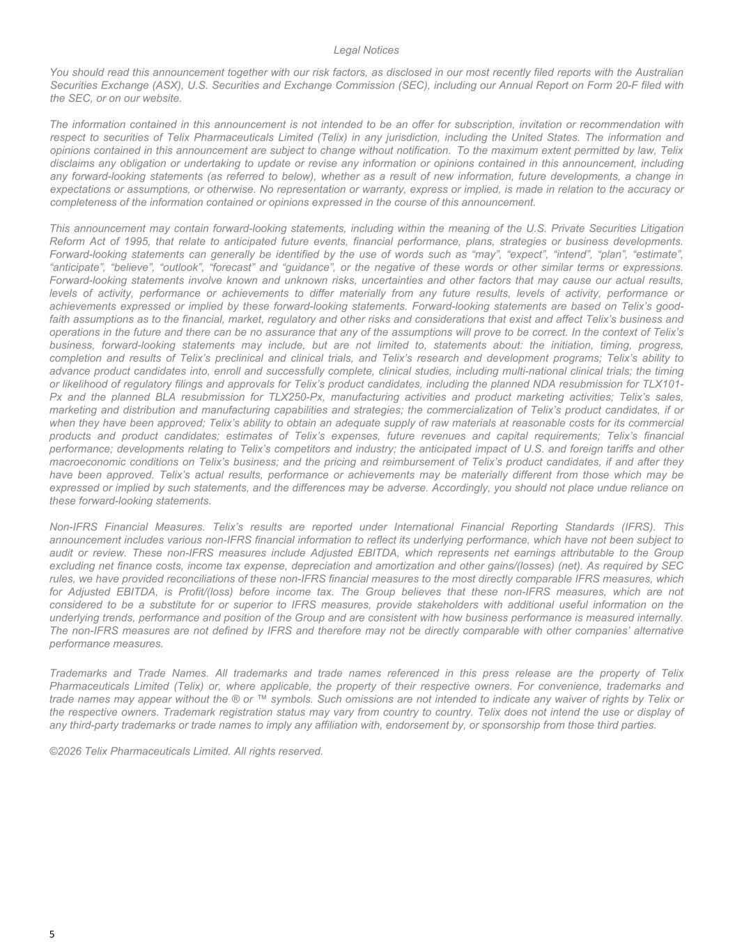 Legal Notices You should read this announcement together with our risk factors, as disclosed in our most recently filed reports with the Australian Securities Exchange (ASX), U.S. Securities and Exchange Commission (SEC), including our Annual Report on Form 20-F filed with the SEC, or on our website. The information contained in this announcement is not intended to be an offer for subscription, invitation or recommendation with respect to securities of Telix Pharmaceuticals Limited (Telix) in any jurisdiction, including the United States. The information and opinions contained in this announcement are subject to change without notification.  To the maximum extent permitted by law, Telix disclaims any obligation or undertaking to update or revise any information or opinions contained in this announcement, including any forward-looking statements (as referred to below), whether as a result of new information, future developments, a change in expectations or assumptions, or otherwise. No representation or warranty, express or implied, is made in relation to the accuracy or completeness of the information contained or opinions expressed in the course of this announcement. This announcement may contain forward-looking statements, including within the meaning of the U.S. Private Securities Litigation Reform Act of 1995, that relate to anticipated future events, financial performance, plans, strategies or business developments. Forward-looking statements can generally be identified by the use of words such as “may”, “expect”, “intend”, “plan”, “estimate”, “anticipate”, “believe”, “outlook”, “forecast” and “guidance”, or the negative of these words or other similar terms or expressions. Forward-looking statements involve known and unknown risks, uncertainties and other factors that may cause our actual results, levels of activity, performance or achievements to differ materially from any future results, levels of activity, performance or achievements expressed or implied by these forward-looking statements. Forward-looking statements are based on Telix’s good- faith assumptions as to the financial, market, regulatory and other risks and considerations that exist and affect Telix’s business and operations in the future and there can be no assurance that any of the assumptions will prove to be correct. In the context of Telix’s business, forward-looking statements may include, but are not limited to, statements about: the initiation, timing, progress, completion and results of Telix’s preclinical and clinical trials, and Telix’s research and development programs; Telix’s ability to advance product candidates into, enroll and successfully complete, clinical studies, including multi-national clinical trials; the timing or likelihood of regulatory filings and approvals for Telix’s product candidates, including the planned NDA resubmission for TLX101- Px and the planned BLA resubmission for TLX250-Px, manufacturing activities and product marketing activities; Telix’s sales, marketing and distribution and manufacturing capabilities and strategies; the commercialization of Telix’s product candidates, if or when they have been approved; Telix’s ability to obtain an adequate supply of raw materials at reasonable costs for its commercial products and product candidates; estimates of Telix’s expenses, future revenues and capital requirements; Telix’s financial performance; developments relating to Telix’s competitors and industry; the anticipated impact of U.S. and foreign tariffs and other macroeconomic conditions on Telix’s business; and the pricing and reimbursement of Telix’s product candidates, if and after they have been approved. Telix’s actual results, performance or achievements may be materially different from those which may be expressed or implied by such statements, and the differences may be adverse. Accordingly, you should not place undue reliance on these forward-looking statements. Non-IFRS Financial Measures. Telix’s results are reported under International Financial Reporting Standards (IFRS). This announcement includes various non-IFRS financial information to reflect its underlying performance, which have not been subject to audit or review. These non-IFRS measures include Adjusted EBITDA, which represents net earnings attributable to the Group excluding net finance costs, income tax expense, depreciation and amortization and other gains/(losses) (net). As required by SEC rules, we have provided reconciliations of these non-IFRS financial measures to the most directly comparable IFRS measures, which for Adjusted EBITDA, is Profit/(loss) before income tax. The Group believes that these non-IFRS measures, which are not considered to be a substitute for or superior to IFRS measures, provide stakeholders with additional useful information on the underlying trends, performance and position of the Group and are consistent with how business performance is measured internally. The non-IFRS measures are not defined by IFRS and therefore may not be directly comparable with other companies’ alternative performance measures. Trademarks and Trade Names. All trademarks and trade names referenced in this press release are the property of Telix Pharmaceuticals Limited (Telix) or, where applicable, the property of their respective owners. For convenience, trademarks and trade names may appear without the ® or ™ symbols. Such omissions are not intended to indicate any waiver of rights by Telix or the respective owners. Trademark registration status may vary from country to country. Telix does not intend the use or display of any third-party trademarks or trade names to imply any affiliation with, endorsement by, or sponsorship from those third parties. ©2026 Telix Pharmaceuticals Limited. All rights reserved. 5