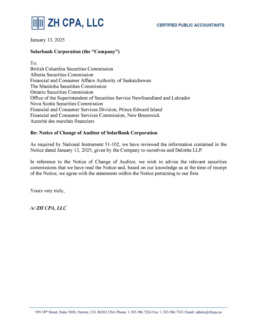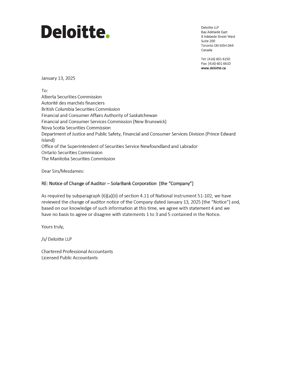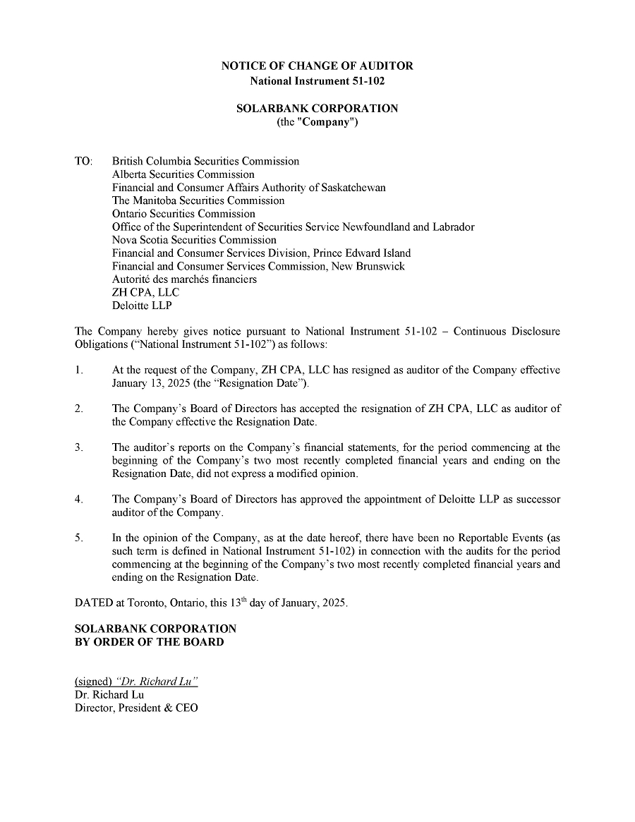 In accordance with the notice-and-access rules under National Instrument 54-101 Communications with Beneficial Owners of Securities of a Reporting Issuer, the Company has sent its proxy-related materials to registered holders and non-objecting beneficial owners using notice-and-access and made its annual financials available to Shareholders. Therefore, although Shareholders still receive a proxy or voting instruction form (as applicable) in paper copy, this Information Circular is not physically delivered. Instead, Shareholders may access this Information Circular on the Company’s website at www.solarbankcorp.com, or on the Company’s profile on SEDAR+ at www.sedarplus.ca.