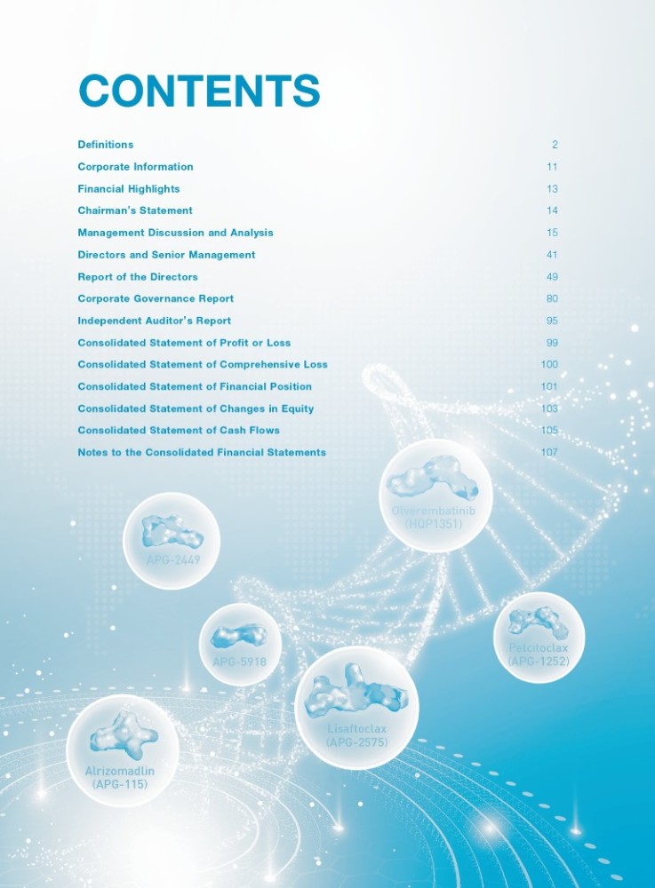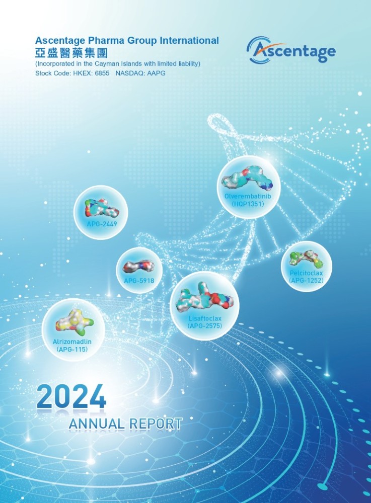 Pelcitoclax ( APG - 1252 ) APG - 2449 APG - 5918 Lisaftoclax ( APG - 2575 ) Alrizomadlin ( APG - 115 ) (Incorporated in the Cayman Islands with limited liability) Stock Code: HKEX: 6855 NASDAQ: AAPG Ascentage Pharma Group International Olverembatinib ( HQP1351 ) 2024 ANNUAL REPORT