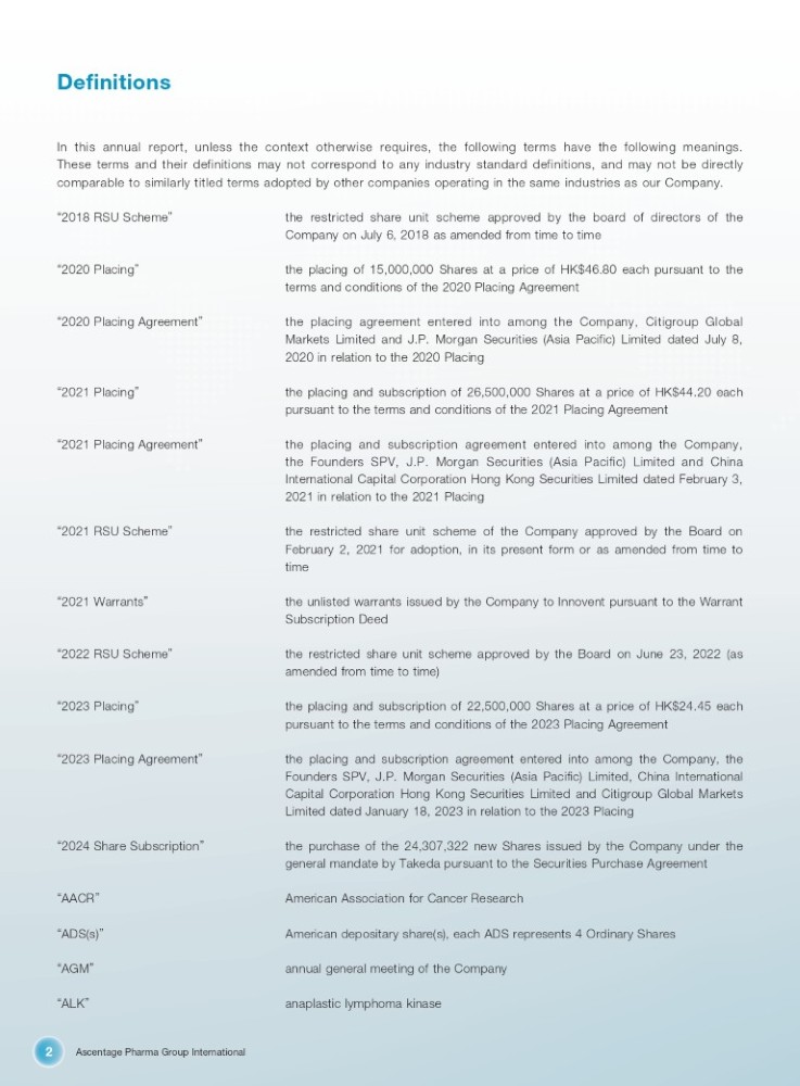 Ascentage Pharma Group International 2 Definitions In this annual report, unless the context otherwise requires, the following terms have the following meanings . These terms and their definitions may not correspond to any industry standard definitions, and may not be directly comparable to similarly titled terms adopted by other companies operating in the same industries as our Company . “ 2018 RSU Scheme ” the restricted share unit scheme approved by the board of directors of the Company on July 6, 2018 as amended from time to time “ 2020 Placing ” the placing of 15,000,000 Shares at a price of HK$46.80 each pursuant to the terms and conditions of the 2020 Placing Agreement “ 2020 Placing Agreement ” the placing agreement entered into among the Company, Citigroup Global Markets Limited and J . P . Morgan Securities (Asia Pacific) Limited dated July 8 , 2020 in relation to the 2020 Placing “ 2021 Placing ” the placing and subscription of 26,500,000 Shares at a price of HK$44.20 each pursuant to the terms and conditions of the 2021 Placing Agreement “ 2021 Placing Agreement ” the placing and subscription agreement entered into among the Company, the Founders SPV, J . P . Morgan Securities (Asia Pacific) Limited and China International Capital Corporation Hong Kong Securities Limited dated February 3 , 2021 in relation to the 2021 Placing “ 2021 RSU Scheme ” the restricted share unit scheme of the Company approved by the Board on February 2 , 2021 for adoption, in its present form or as amended from time to time “ 2021 Warrants ” the unlisted warrants issued by the Company to Innovent pursuant to the Warrant Subscription Deed “ 2022 RSU Scheme ” the restricted share unit scheme approved by the Board on June 23, 2022 (as amended from time to time) “ 2023 Placing ” the placing and subscription of 22,500,000 Shares at a price of HK$24.45 each pursuant to the terms and conditions of the 2023 Placing Agreement “ 2023 Placing Agreement ” the placing and subscription agreement entered into among the Company, the Founders SPV, J . P . Morgan Securities (Asia Pacific) Limited, China International Capital Corporation Hong Kong Securities Limited and Citigroup Global Markets Limited dated January 18 , 2023 in relation to the 2023 Placing “ 2024 Share Subscription ” the purchase of the 24,307,322 new Shares issued by the Company under the general mandate by Takeda pursuant to the Securities Purchase Agreement “ AACR ” American Association for Cancer Research “ ADS(s) ” American depositary share(s), each ADS represents 4 Ordinary Shares “ AGM ” annual general meeting of the Company “ ALK ” anaplastic lymphoma kinase