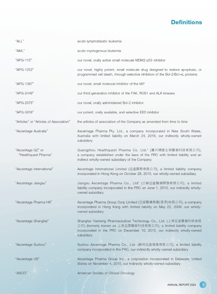 ANNUAL REPORT 2024 3 Definitions “ ALL ” acute lymphoblastic leukemia “ AML ” acute myelogenous leukemia “ APG - 115 ” our novel, orally active small molecule MDM2 - p53 inhibitor “ APG - 1252 ” our novel, highly potent, small molecule drug designed to restore apoptosis, or programmed cell death, through selective inhibition of the Bcl - 2/Bcl - xL proteins “ APG - 1387 ” our novel, small molecule inhibitor of the IAP “ APG - 2449 ” our third - generation inhibitor of the FAK, ROS1 and ALK kinases “ APG - 2575 ” our novel, orally administered Bcl - 2 inhibitor “ APG - 5918 ” our potent, orally available, and selective EED inhibitor “ Articles ” or “ Articles of Association ” the articles of association of the Company as amended from time to time “ Ascentage Australia ” Ascentage Pharma Pty . Ltd . , a company incorporated in New South Wales, Australia with limited liability on March 24 , 2016 , our indirectly wholly - owned subsidiary “ Ascentage GZ ” or “ Healthquest Pharma ” Guangzhou Healthquest Pharma Co . Ltd . * ( ᔓᐎ丶ڕ⭏⢙䟛㰕、ᢰᴹ䲀ޜਨ ), a company established under the laws of the PRC with limited liability and an indirect wholly - owned subsidiary of the Company “ Ascentage International ” Ascentage International Limited ( ӎⴋ഻䳋ᴹ䲀ޜਨ ), a limited liability company incorporated in Hong Kong on October 28 , 2015 , our wholly - owned subsidiary “ Ascentage Jiangsu ” Jiangsu Ascentage Pharma Co . , Ltd* ( ⊏㰷ӎⴋ䟛㰕䮻Ⲭᴹ䲀ޜਨ ), a limited liability company incorporated in the PRC on June 1 , 2010 , our indirectly wholly - owned subsidiary “ Ascentage Pharma HK ” Ascentage Pharma Group Corp Limited ( ӎⴋ䟛㰕䳶ൈ ( 俉⑟ ) ᴹ䲀ޜਨ ), a company incorporated in Hong Kong with limited liability on May 22 , 2009 , our wholly - owned subsidiary “ Ascentage Shanghai ” Shanghai Yasheng Pharmaceutical Technology Co . , Ltd . ( к⎧ӎⴋ䟛㰕、ᢰᴹ䲀 ޜਨ ) (formerly known as к⎧ӎ᲏䟛㰕、ᢰᴹ䲀ޜਨ ), a limited liability company incorporated in the PRC on December 10 , 2015 , our indirectly wholly - owned subsidiary “ Ascentage Suzhou ” Suzhou Ascentage Pharma Co. , Ltd . ( 㰷ᐎӎⴋ㰕ᾝᴹ䲀ޜਨ ), a limited liability company incorporated in the PRC , our indirectly wholly - owned subsidiary “ Ascentage US ” Ascentage Pharma Group Inc., a corporation incorporated in Delaware, United States on November 4, 2015, our indirectly wholly - owned subsidiary “ ASCO ” American Society of Clinical Oncology