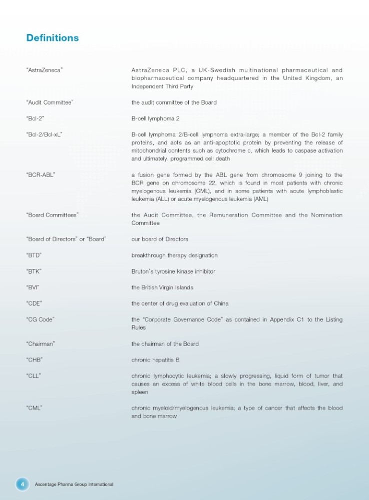 Ascentage Pharma Group International 4 Definitions “ AstraZeneca ” AstraZeneca PLC, a UK - Swedish multinational pharmaceutical and biopharmaceutical company headquartered in the United Kingdom, an Independent Third Party “ Audit Committee ” the audit committee of the Board “ Bcl - 2 ” B - cell lymphoma 2 “ Bcl - 2/Bcl - xL ” B - cell lymphoma 2 /B - cell lymphoma extra - large ; a member of the Bcl - 2 family proteins, and acts as an anti - apoptotic protein by preventing the release of mitochondrial contents such as cytochrome c, which leads to caspase activation and ultimately, programmed cell death “ BCR - ABL ” a fusion gene formed by the ABL gene from chromosome 9 joining to the BCR gene on chromosome 22 , which is found in most patients with chronic myelogenous leukemia (CML), and in some patients with acute lymphoblastic leukemia (ALL) or acute myelogenous leukemia (AML) “ Board Committees ” the Audit Committee, the Remuneration Committee and the Nomination Committee “ Board of Directors ” or “ Board ” our board of Directors “ BTD ” breakthrough therapy designation “ BTK ” Bruton ’ s tyrosine kinase inhibitor “ BVI ” the British Virgin Islands “ CDE ” the center of drug evaluation of China “ CG Code ” the “ Corporate Governance Code ” as contained in Appendix C1 to the Listing Rules “ Chairman ” the chairman of the Board “ CHB ” chronic hepatitis B “ CLL ” chronic lymphocytic leukemia ; a slowly progressing, liquid form of tumor that causes an excess of white blood cells in the bone marrow, blood, liver, and spleen “ CML ” chronic myeloid/myelogenous leukemia; a type of cancer that affects the blood and bone marrow