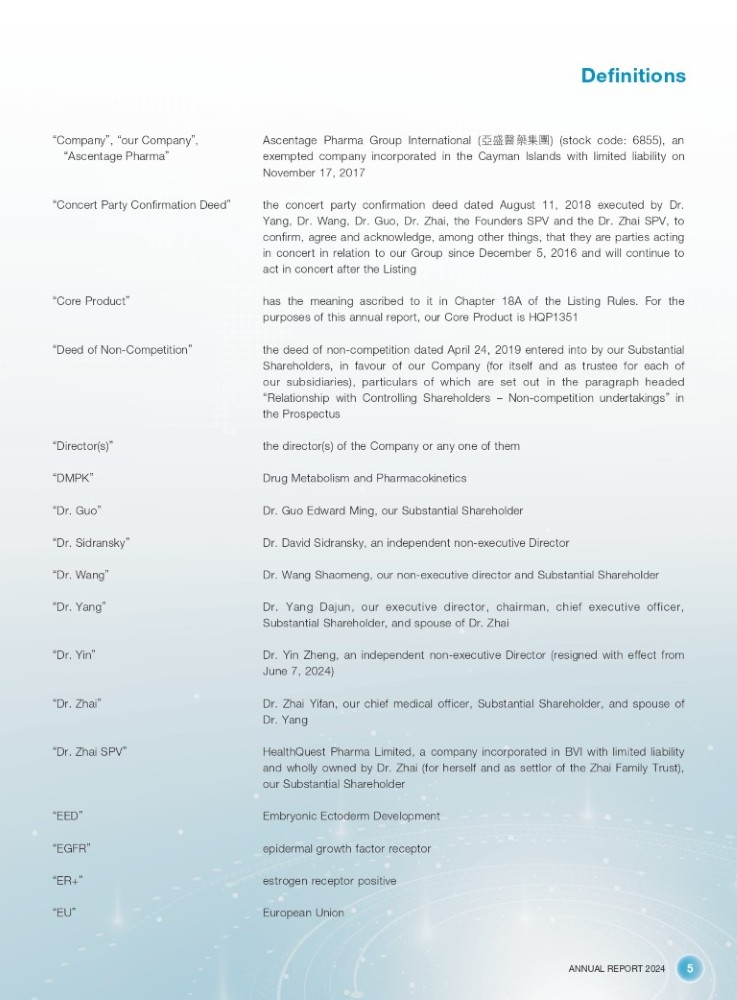 ANNUAL REPORT 2024 5 Definitions “ Company ” , “ our Company ” , “ Ascentage Pharma ” Ascentage Pharma Group International ( ӎⴋ䟛㰕䳶ൈ ) (stock code : 6855 ), an exempted company incorporated in the Cayman Islands with limited liability on November 17 , 2017 “ Concert Party Confirmation Deed ” the concert party confirmation deed dated August 11 , 2018 executed by Dr . Yang, Dr . Wang, Dr . Guo, Dr . Zhai, the Founders SPV and the Dr . Zhai SPV, to confirm, agree and acknowledge, among other things, that they are parties acting in concert in relation to our Group since December 5 , 2016 and will continue to act in concert after the Listing “ Core Product ” has the meaning ascribed to it in Chapter 18A of the Listing Rules. For the purposes of this annual report, our Core Product is HQP1351 “ Deed of Non - Competition ” the deed of non - competition dated April 24 , 2019 entered into by our Substantial Shareholders, in favour of our Company (for itself and as trustee for each of our subsidiaries), particulars of which are set out in the paragraph headed “ Relationship with Controlling Shareholders – Non - competition undertakings ” in the Prospectus “ Director(s) ” the director(s) of the Company or any one of them “ DMPK ” Drug Metabolism and Pharmacokinetics “ Dr. Guo ” Dr. Guo Edward Ming, our Substantial Shareholder “ Dr. Sidransky ” Dr. David Sidransky, an independent non - executive Director “ Dr. Wang ” Dr. Wang Shaomeng, our non - executive director and Substantial Shareholder “ Dr. Yang ” Dr. Yang Dajun, our executive director, chairman, chief executive officer, Substantial Shareholder, and spouse of Dr. Zhai “ Dr. Yin ” Dr. Yin Zheng, an independent non - executive Director (resigned with effect from June 7, 2024) “ Dr. Zhai ” Dr. Zhai Yifan, our chief medical officer, Substantial Shareholder, and spouse of Dr. Yang “ Dr. Zhai SPV ” HealthQuest Pharma Limited, a company incorporated in BVI with limited liability and wholly owned by Dr . Zhai (for herself and as settlor of the Zhai Family Trust), our Substantial Shareholder “ EED ” Embryonic Ectoderm Development “ EGFR ” epidermal growth factor receptor “ ER+ ” estrogen receptor positive “ EU ” European Union