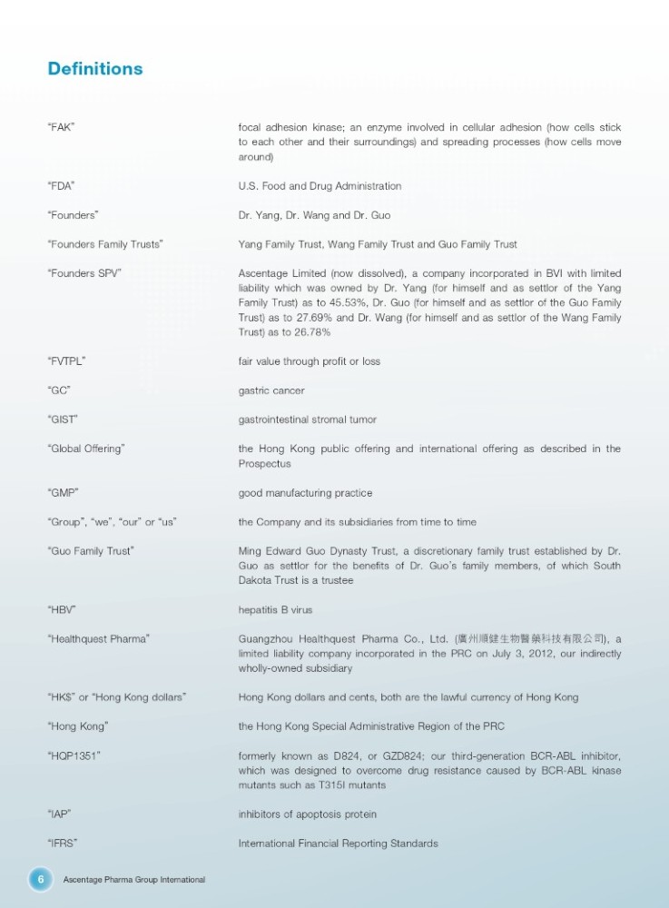 Ascentage Pharma Group International 6 Definitions “ FAK ” focal adhesion kinase ; an enzyme involved in cellular adhesion (how cells stick to each other and their surroundings) and spreading processes (how cells move around) “ FDA ” U.S. Food and Drug Administration “ Founders ” Dr. Yang, Dr. Wang and Dr. Guo “ Founders Family Trusts ” Yang Family Trust, Wang Family Trust and Guo Family Trust “ Founders SPV ” Ascentage Limited (now dissolved), a company incorporated in BVI with limited liability which was owned by Dr . Yang (for himself and as settlor of the Yang Family Trust) as to 45 . 53 % , Dr . Guo (for himself and as settlor of the Guo Family Trust) as to 27 . 69 % and Dr . Wang (for himself and as settlor of the Wang Family Trust) as to 26 . 78 % “ FVTPL ” fair value through profit or loss “ GC ” gastric cancer “ GIST ” gastrointestinal stromal tumor “ Global Offering ” the Hong Kong public offering and international offering as described in the Prospectus “ GMP ” good manufacturing practice “ Group ” , “ we ” , “ our ” or “ us ” the Company and its subsidiaries from time to time “ Guo Family Trust ” Ming Edward Guo Dynasty Trust, a discretionary family trust established by Dr . Guo as settlor for the benefits of Dr . Guo ’ s family members, of which South Dakota Trust is a trustee “ HBV ” hepatitis B virus “ Healthquest Pharma ” Guangzhou Healthquest Pharma Co . , Ltd . ( ᔓᐎ丶ڕ⭏⢙䟛㰕、ᢰᴹ䲀ޜਨ ), a limited liability company incorporated in the PRC on July 3 , 2012 , our indirectly wholly - owned subsidiary “ HK$ ” or “ Hong Kong dollars ” Hong Kong dollars and cents, both are the lawful currency of Hong Kong “ Hong Kong ” the Hong Kong Special Administrative Region of the PRC “ HQP1351 ” formerly known as D 824 , or GZD 824 ; our third - generation BCR - ABL inhibitor, which was designed to overcome drug resistance caused by BCR - ABL kinase mutants such as T 315 I mutants “ IAP ” inhibitors of apoptosis protein “ IFRS ” International Financial Reporting Standards
