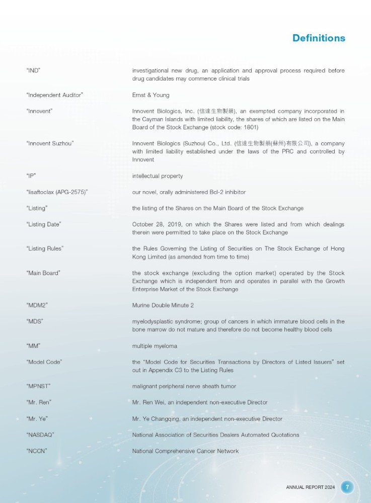 ANNUAL REPORT 2024 7 Definitions “ IND ” investigational new drug, an application and approval process required before drug candidates may commence clinical trials “ Independent Auditor ” Ernst & Young “ Innovent ” Innovent Biologics , Inc . ( ؑ䚄⭏⢙㼭㰕 ), an exempted company incorporated in the Cayman Islands with limited liability , the shares of which are listed on the Main Board of the Stock Exchange (stock code : 1801 ) “ Innovent Suzhou ” Innovent Biologics (Suzhou ) Co . , Ltd . ( ؑ䚄⭏⢙㼭㰕 ( 㰷ᐎ ) ᴹ䲀ޜਨ ), a company with limited liability established under the laws of the PRC and controlled by Innovent “ IP ” intellectual property “ lisaftoclax (APG - 2575) ” our novel, orally administered Bcl - 2 inhibitor “ Listing ” the listing of the Shares on the Main Board of the Stock Exchange “ Listing Date ” October 28, 2019, on which the Shares were listed and from which dealings therein were permitted to take place on the Stock Exchange “ Listing Rules ” the Rules Governing the Listing of Securities on The Stock Exchange of Hong Kong Limited (as amended from time to time) “ Main Board ” the stock exchange (excluding the option market) operated by the Stock Exchange which is independent from and operates in parallel with the Growth Enterprise Market of the Stock Exchange “ MDM2 ” Murine Double Minute 2 “ MDS ” myelodysplastic syndrome; group of cancers in which immature blood cells in the bone marrow do not mature and therefore do not become healthy blood cells “ MM ” multiple myeloma “ Model Code ” the “ Model Code for Securities Transactions by Directors of Listed Issuers ” set out in Appendix C3 to the Listing Rules “ MPNST ” malignant peripheral nerve sheath tumor “ Mr. Ren ” Mr. Ren Wei, an independent non - executive Director “ Mr. Ye ” Mr. Ye Changqing, an independent non - executive Director “ NASDAQ ” National Association of Securities Dealers Automated Quotations “ NCCN ” National Comprehensive Cancer Network