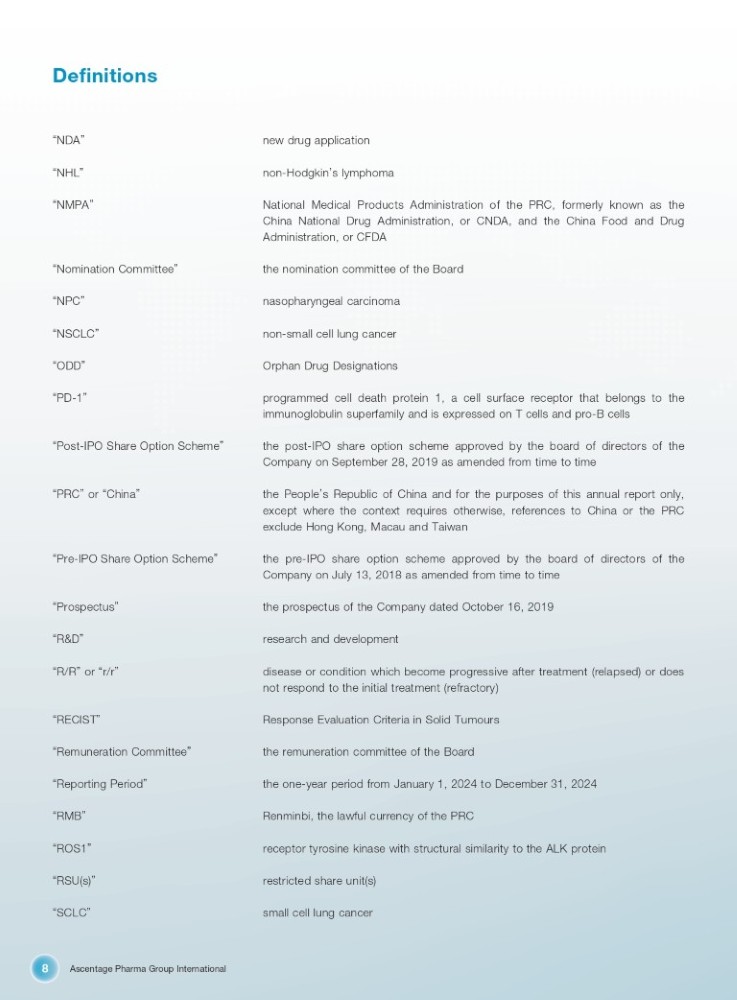 Ascentage Pharma Group International 8 Definitions “ NDA ” new drug application “ NHL ” non - Hodgkin ’ s lymphoma “ NMPA ” National Medical Products Administration of the PRC, formerly known as the China National Drug Administration, or CNDA, and the China Food and Drug Administration, or CFDA “ Nomination Committee ” the nomination committee of the Board “ NPC ” nasopharyngeal carcinoma “ NSCLC ” non - small cell lung cancer “ ODD ” Orphan Drug Designations “ PD - 1 ” programmed cell death protein 1, a cell surface receptor that belongs to the immunoglobulin superfamily and is expressed on T cells and pro - B cells “ Post - IPO Share Option Scheme ” the post - IPO share option scheme approved by the board of directors of the Company on September 28, 2019 as amended from time to time “ PRC ” or “ China ” the People ’ s Republic of China and for the purposes of this annual report only, except where the context requires otherwise, references to China or the PRC exclude Hong Kong, Macau and Taiwan “ Pre - IPO Share Option Scheme ” the pre - IPO share option scheme approved by the board of directors of the Company on July 13, 2018 as amended from time to time “ Prospectus ” the prospectus of the Company dated October 16, 2019 “ R&D ” research and development “ R/R ” or “ r/r ” disease or condition which become progressive after treatment (relapsed) or does not respond to the initial treatment (refractory) “ RECIST ” Response Evaluation Criteria in Solid Tumours “ Remuneration Committee ” the remuneration committee of the Board “ Reporting Period ” the one - year period from January 1, 2024 to December 31, 2024 “ RMB ” Renminbi, the lawful currency of the PRC “ ROS1 ” receptor tyrosine kinase with structural similarity to the ALK protein “ RSU(s) ” restricted share unit(s) “ SCLC ” small cell lung cancer