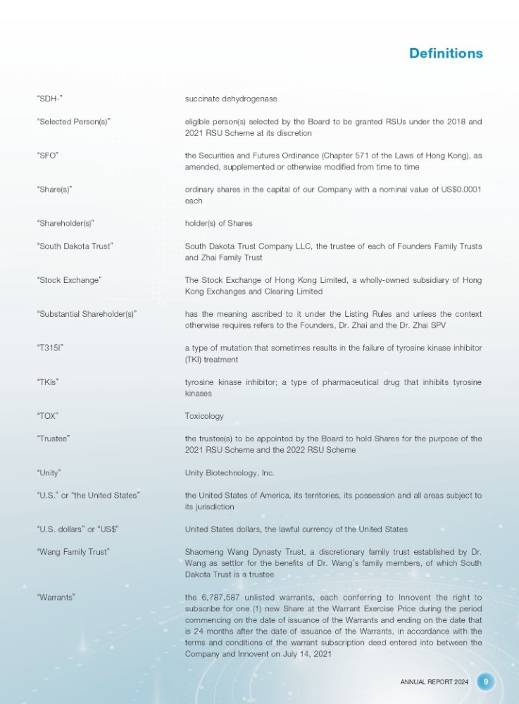 ANNUAL REPORT 2024 9 Definitions “ SDH - ” succinate dehydrogenase “ Selected Person(s) ” eligible person(s) selected by the Board to be granted RSUs under the 2018 and 2021 RSU Scheme at its discretion “ SFO ” the Securities and Futures Ordinance (Chapter 571 of the Laws of Hong Kong), as amended, supplemented or otherwise modified from time to time “ Share(s) ” ordinary shares in the capital of our Company with a nominal value of US$0.0001 each “ Shareholder(s) ” holder(s) of Shares “ South Dakota Trust ” South Dakota Trust Company LLC, the trustee of each of Founders Family Trusts and Zhai Family Trust “ Stock Exchange ” The Stock Exchange of Hong Kong Limited, a wholly - owned subsidiary of Hong Kong Exchanges and Clearing Limited “ Substantial Shareholder(s) ” has the meaning ascribed to it under the Listing Rules and unless the context otherwise requires refers to the Founders, Dr. Zhai and the Dr. Zhai SPV “ T315I ” a type of mutation that sometimes results in the failure of tyrosine kinase inhibitor (TKI) treatment “ TKIs ” tyrosine kinase inhibitor; a type of pharmaceutical drug that inhibits tyrosine kinases “ TOX ” Toxicology “ Trustee ” the trustee(s) to be appointed by the Board to hold Shares for the purpose of the 2021 RSU Scheme and the 2022 RSU Scheme “ Unity ” Unity Biotechnology, Inc. “ U.S. ” or “ the United States ” the United States of America, its territories, its possession and all areas subject to its jurisdiction “ U.S. dollars ” or “ US$ ” United States dollars, the lawful currency of the United States “ Wang Family Trust ” Shaomeng Wang Dynasty Trust, a discretionary family trust established by Dr . Wang as settlor for the benefits of Dr . Wang ’ s family members, of which South Dakota Trust is a trustee “ Warrants ” the 6 , 787 , 587 unlisted warrants, each conferring to Innovent the right to subscribe for one ( 1 ) new Share at the Warrant Exercise Price during the period commencing on the date of issuance of the Warrants and ending on the date that is 24 months after the date of issuance of the Warrants, in accordance with the terms and conditions of the warrant subscription deed entered into between the Company and Innovent on July 14 , 2021