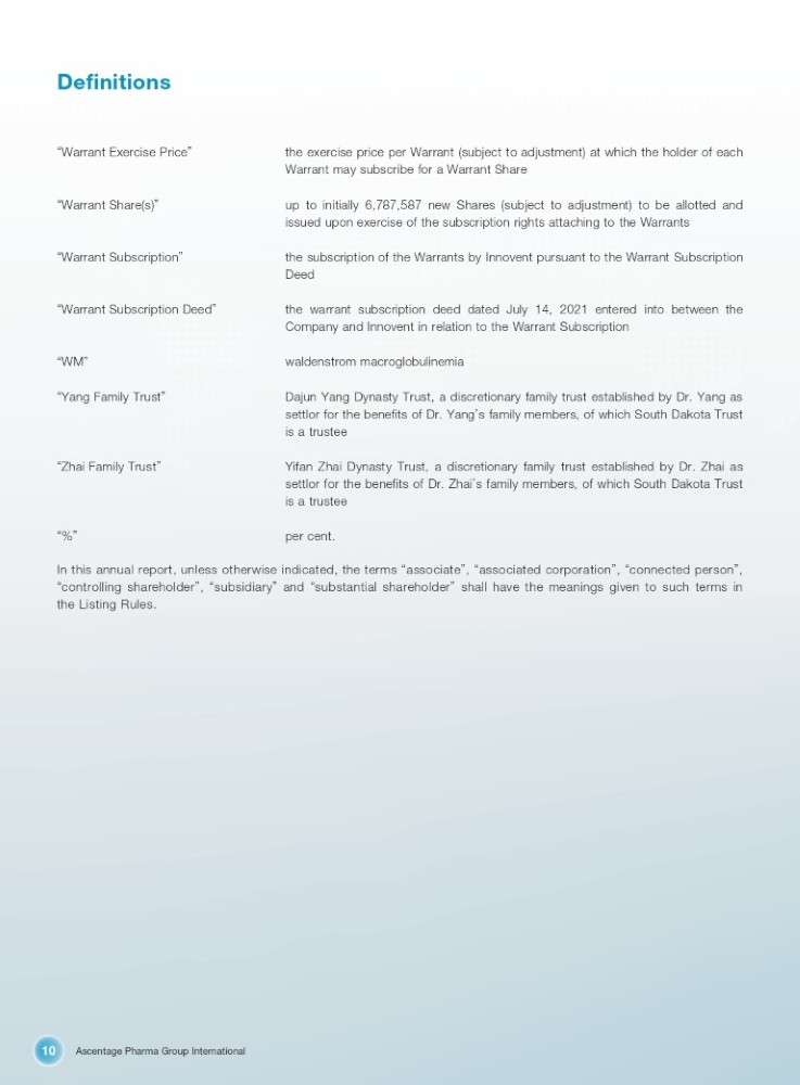 Ascentage Pharma Group International 10 Definitions “ Warrant Exercise Price ” the exercise price per Warrant (subject to adjustment) at which the holder of each Warrant may subscribe for a Warrant Share “ Warrant Share(s) ” up to initially 6,787,587 new Shares (subject to adjustment) to be allotted and issued upon exercise of the subscription rights attaching to the Warrants “ Warrant Subscription ” the subscription of the Warrants by Innovent pursuant to the Warrant Subscription Deed “ Warrant Subscription Deed ” the warrant subscription deed dated July 14, 2021 entered into between the Company and Innovent in relation to the Warrant Subscription “ WM ” waldenstrom macroglobulinemia “ Yang Family Trust ” Dajun Yang Dynasty Trust, a discretionary family trust established by Dr . Yang as settlor for the benefits of Dr . Yang ’ s family members, of which South Dakota Trust is a trustee “ Zhai Family Trust ” Yifan Zhai Dynasty Trust, a discretionary family trust established by Dr . Zhai as settlor for the benefits of Dr . Zhai ’ s family members, of which South Dakota Trust is a trustee “ % ” per cent . In this annual report, unless otherwise indicated, the terms “ associate ” , “ associated corporation ” , “ connected person ” , “ controlling shareholder ” , “ subsidiary ” and “ substantial shareholder ” shall have the meanings given to such terms in the Listing Rules .