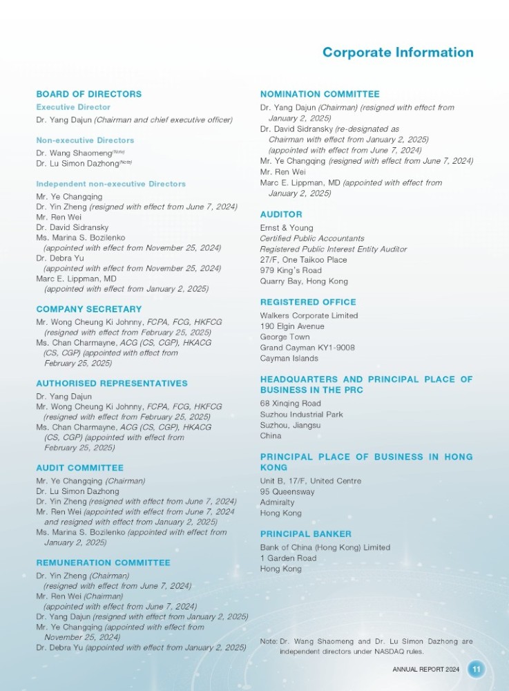 ANNUAL REPORT 2024 11 Corporate Information BOARD OF DIRECTORS Executive Director Dr. Yang Dajun (Chairman and chief executive officer) Non - executive Directors Dr. Wang Shaomeng (Note) Dr. Lu Simon Dazhong (Note) Independent non - executive Directors Mr. Ye Changqing Dr. Yin Zheng (resigned with effect from June 7, 2024) Mr. Ren Wei Dr. David Sidransky Ms. Marina S. Bozilenko (appointed with effect from November 25, 2024) Dr. Debra Yu (appointed with effect from November 25, 2024) Marc E. Lippman, MD (appointed with effect from January 2, 2025) COMPANY SECRETARY Mr. Wong Cheung Ki Johnny, FCPA, FCG, HKFCG (resigned with effect from February 25, 2025) Ms. Chan Charmayne, ACG (CS, CGP), HKACG (CS, CGP) (appointed with effect from February 25, 2025) AUTHORISED REPRESENTATIVES Dr. Yang Dajun Mr. Wong Cheung Ki Johnny, FCPA, FCG, HKFCG (resigned with effect from February 25, 2025) Ms. Chan Charmayne, ACG (CS, CGP), HKACG (CS, CGP) (appointed with effect from February 25, 2025) AUDIT COMMITTEE Mr. Ye Changqing (Chairman) Dr. Lu Simon Dazhong Dr. Yin Zheng (resigned with effect from June 7, 2024) Mr. Ren Wei (appointed with effect from June 7, 2024 and resigned with effect from January 2, 2025) Ms. Marina S. Bozilenko (appointed with effect from January 2, 2025) REMUNERATION COMMITTEE Dr. Yin Zheng (Chairman) (resigned with effect from June 7, 2024) Mr. Ren Wei (Chairman) (appointed with effect from June 7, 2024) Dr. Yang Dajun (resigned with effect from January 2, 2025) Mr. Ye Changqing (appointed with effect from November 25, 2024) Dr. Debra Yu (appointed with effect from January 2, 2025) Note: Dr. Wang Shaomeng and Dr. Lu Simon Dazhong are independent directors under NASDAQ rules. NOMINATION COMMITTEE Dr. Yang Dajun (Chairman) (resigned with effect from January 2, 2025) Dr. David Sidransky (re - designated as Chairman with effect from January 2, 2025) (appointed with effect from June 7, 2024) Mr. Ye Changqing (resigned with effect from June 7, 2024) Mr. Ren Wei Marc E. Lippman, MD (appointed with effect from January 2, 2025) AUDITOR Ernst & Young Certified Public Accountants Registered Public Interest Entity Auditor 27/F, One Taikoo Place 979 King ’ s Road Quarry Bay, Hong Kong REGISTERED OFFICE Walkers Corporate Limited 190 Elgin Avenue George Town Grand Cayman KY1 - 9008 Cayman Islands HEADQUARTERS AND PRINCIPAL PLACE OF BUSINESS IN THE PRC 68 Xinqing Road Suzhou Industrial Park Suzhou, Jiangsu China PRINCIPAL PLACE OF BUSINESS IN HONG KONG Unit B, 17/F, United Centre 95 Queensway Admiralty Hong Kong PRINCIPAL BANKER Bank of China (Hong Kong) Limited 1 Garden Road Hong Kong