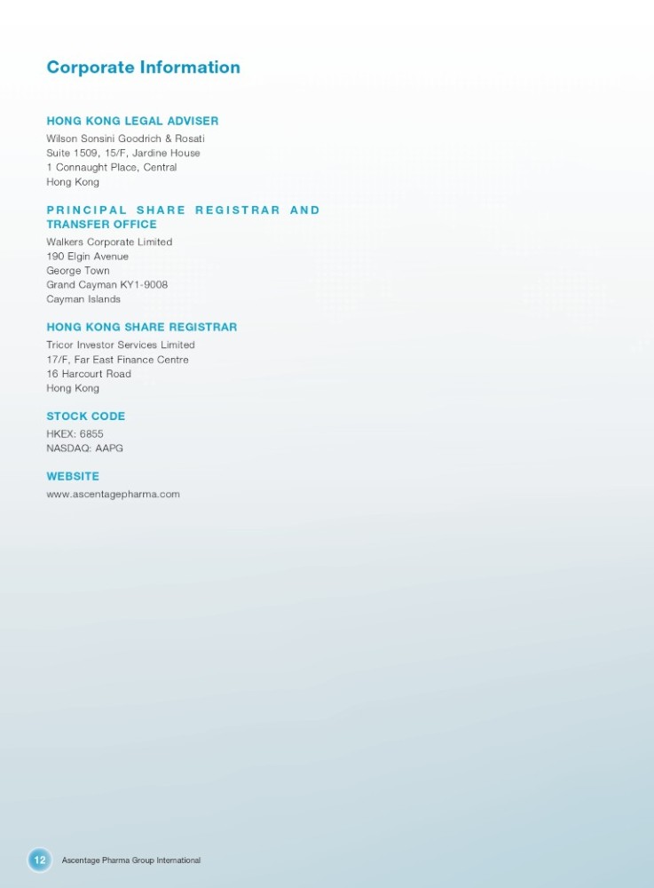 Ascentage Pharma Group International 12 Corporate Information HONG KONG LEGAL ADVISER Wilson Sonsini Goodrich & Rosati Suite 1509, 15/F, Jardine House 1 Connaught Place, Central Hong Kong PRINCIPAL SHARE REGISTRAR AND TRANSFER OFFICE Walkers Corporate Limited 190 Elgin Avenue George Town Grand Cayman KY1 - 9008 Cayman Islands HONG KONG SHARE REGISTRAR Tricor Investor Services Limited 17/F, Far East Finance Centre 16 Harcourt Road Hong Kong STOCK CODE HKEX: 6855 NASDAQ: AAPG WEBSITE www.ascentagepharma.com