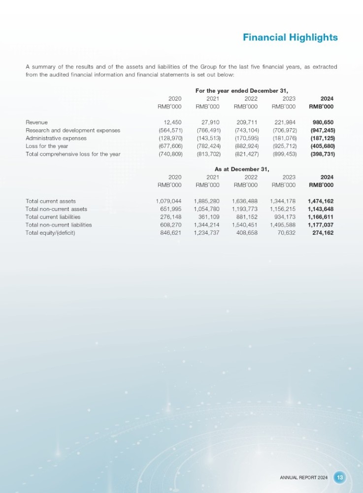 ANNUAL REPORT 2024 13 Financial Highlights A summary of the results and of the assets and liabilities of the Group for the last five financial years, as extracted from the audited financial information and financial statements is set out below: For the year ended December 31, 2024 RMB ’ 000 2023 RMB ’ 000 2022 RMB ’ 000 2021 RMB ’ 000 2020 RMB ’ 000 980,650 221,984 209,711 27,910 12,450 Revenue (947,245) (706,972) (743,104) (766,491) (564,571) Research and development expenses (187,125) (181,076) (170,595) (143,513) (128,970) Administrative expenses (405,680) (925,712) (882,924) (782,424) (677,606) Loss for the year (398,731) (899,453) (821,427) (813,702) (740,809) Total comprehensive loss for the year As at December 31, 2024 RMB ’ 000 2023 RMB ’ 000 2022 RMB ’ 000 2021 RMB ’ 000 2020 RMB ’ 000 1,474,162 1,344,178 1,636,488 1,885,280 1,079,044 Total current assets 1,143,648 1,156,215 1,193,773 1,054,780 651,995 Total non - current assets 1,166,611 934,173 881,152 361,109 276,148 Total current liabilities 1,177,037 1,495,588 1,540,451 1,344,214 608,270 Total non - current liabilities 274,162 70,632 408,658 1,234,737 846,621 Total equity/(deficit)