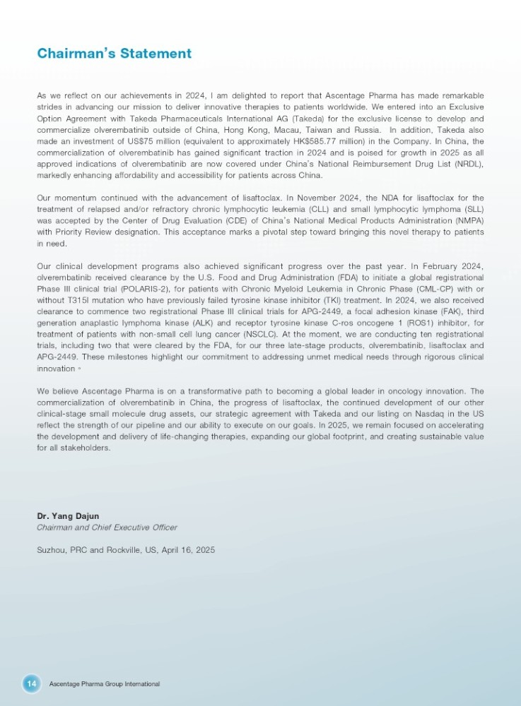 Ascentage Pharma Group International 14 Chairman ’ s Statement As we reflect on our achievements in 2024 , I am delighted to report that Ascentage Pharma has made remarkable strides in advancing our mission to deliver innovative therapies to patients worldwide . We entered into an Exclusive Option Agreement with Takeda Pharmaceuticals International AG (Takeda) for the exclusive license to develop and commercialize olverembatinib outside of China, Hong Kong, Macau, Taiwan and Russia . In addition, Takeda also made an investment of US $ 75 million (equivalent to approximately HK $ 585 . 77 million) in the Company . In China, the commercialization of olverembatinib has gained significant traction in 2024 and is poised for growth in 2025 as all approved indications of olverembatinib are now covered under China ’ s National Reimbursement Drug List (NRDL), markedly enhancing affordability and accessibility for patients across China . Our momentum continued with the advancement of lisaftoclax . In November 2024 , the NDA for lisaftoclax for the treatment of relapsed and/or refractory chronic lymphocytic leukemia (CLL) and small lymphocytic lymphoma (SLL) was accepted by the Center of Drug Evaluation (CDE) of China ’ s National Medical Products Administration (NMPA) with Priority Review designation . This acceptance marks a pivotal step toward bringing this novel therapy to patients in need . Our clinical development programs also achieved significant progress over the past year . In February 2024 , olverembatinib received clearance by the U . S . Food and Drug Administration (FDA ) to initiate a global registrational Phase III clinical trial (POLARIS - 2 ) , for patients with Chronic Myeloid Leukemia in Chronic Phase (CML - CP ) with or without T 315 I mutation who have previously failed tyrosine kinase inhibitor (TKI ) treatment . In 2024 , we also received clearance to commence two registrational Phase III clinical trials for APG - 2449 , a focal adhesion kinase (FAK) , third generation anaplastic lymphoma kinase (ALK ) and receptor tyrosine kinase C - ros oncogene 1 (ROS 1 ) inhibitor , for treatment of patients with non - small cell lung cancer (NSCLC) . At the moment , we are conducting ten registrational trials , including two that were cleared by the FDA , for our three late - stage products , olverembatinib , lisaftoclax and APG - 2449 . These milestones highlight our commitment to addressing unmet medical needs through rigorous clinical innovation DŽ We believe Ascentage Pharma is on a transformative path to becoming a global leader in oncology innovation . The commercialization of olverembatinib in China, the progress of lisaftoclax, the continued development of our other clinical - stage small molecule drug assets, our strategic agreement with Takeda and our listing on Nasdaq in the US reflect the strength of our pipeline and our ability to execute on our goals . In 2025 , we remain focused on accelerating the development and delivery of life - changing therapies, expanding our global footprint, and creating sustainable value for all stakeholders . Dr. Yang Dajun Chairman and Chief Executive Officer Suzhou, PRC and Rockville, US, April 16, 2025
