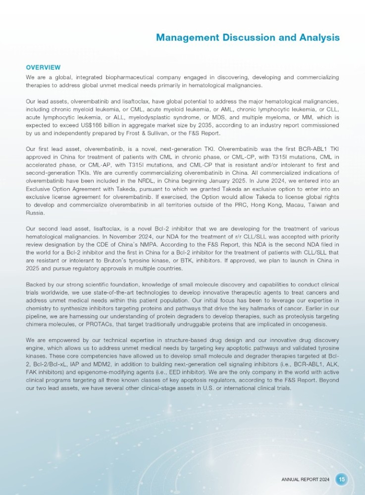ANNUAL REPORT 2024 15 Management Discussion and Analysis OVERVIEW We are a global, integrated biopharmaceutical company engaged in discovering, developing and commercializing therapies to address global unmet medical needs primarily in hematological malignancies . Our lead assets, olverembatinib and lisaftoclax, have global potential to address the major hematological malignancies, including chronic myeloid leukemia, or CML, acute myeloid leukemia, or AML, chronic lymphocytic leukemia, or CLL, acute lymphocytic leukemia, or ALL, myelodysplastic syndrome, or MDS, and multiple myeloma, or MM, which is expected to exceed US $ 166 billion in aggregate market size by 2035 , according to an industry report commissioned by us and independently prepared by Frost & Sullivan, or the F&S Report . Our first lead asset, olverembatinib, is a novel, next - generation TKI . Olverembatinib was the first BCR - ABL 1 TKI approved in China for treatment of patients with CML in chronic phase, or CML - CP, with T 315 I mutations, CML in accelerated phase, or CML - AP, with T 315 I mutations, and CML - CP that is resistant and/or intolerant to first and second - generation TKIs . We are currently commercializing olverembatinib in China . All commercialized indications of olverembatinib have been included in the NRDL, in China beginning January 2025 . In June 2024 , we entered into an Exclusive Option Agreement with Takeda, pursuant to which we granted Takeda an exclusive option to enter into an exclusive license agreement for olverembatinib . If exercised, the Option would allow Takeda to license global rights to develop and commercialize olverembatinib in all territories outside of the PRC, Hong Kong, Macau, Taiwan and Russia . Our second lead asset, lisaftoclax, is a novel Bcl - 2 inhibitor that we are developing for the treatment of various hematological malignancies . In November 2024 , our NDA for the treatment of r/r CLL/SLL was accepted with priority review designation by the CDE of China ’ s NMPA . According to the F&S Report, this NDA is the second NDA filed in the world for a Bcl - 2 inhibitor and the first in China for a Bcl - 2 inhibitor for the treatment of patients with CLL/SLL that are resistant or intolerant to Bruton ’ s tyrosine kinase, or BTK, inhibitors . If approved, we plan to launch in China in 2025 and pursue regulatory approvals in multiple countries . Backed by our strong scientific foundation, knowledge of small molecule discovery and capabilities to conduct clinical trials worldwide, we use state - of - the - art technologies to develop innovative therapeutic agents to treat cancers and address unmet medical needs within this patient population . Our initial focus has been to leverage our expertise in chemistry to synthesize inhibitors targeting proteins and pathways that drive the key hallmarks of cancer . Earlier in our pipeline, we are harnessing our understanding of protein degraders to develop therapies, such as proteolysis targeting chimera molecules, or PROTACs, that target traditionally undruggable proteins that are implicated in oncogenesis . We are empowered by our technical expertise in structure - based drug design and our innovative drug discovery engine, which allows us to address unmet medical needs by targeting key apoptotic pathways and validated tyrosine kinases . These core competencies have allowed us to develop small molecule and degrader therapies targeted at Bcl - 2 , Bcl - 2 /Bcl - xL, IAP and MDM 2 , in addition to building next - generation cell signaling inhibitors (i . e . , BCR - ABL 1 , ALK, FAK inhibitors) and epigenome - modifying agents (i . e . , EED inhibitor) . We are the only company in the world with active clinical programs targeting all three known classes of key apoptosis regulators, according to the F&S Report . Beyond our two lead assets, we have several other clinical - stage assets in U . S . or international clinical trials .