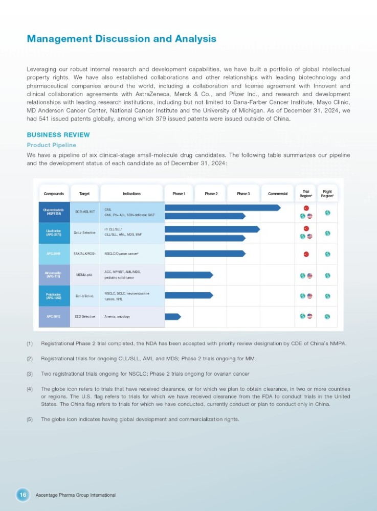 Ascentage Pharma Group International 16 Management Discussion and Analysis Olverembatinib (HQP1351) Lisaftoclax (APG - 2575) APG - 2449 Alrizomadlin (APG - 115) Pelcitoclax (APG - 1252) APG - 5918 BCR - ABL/KIT CML CML, Ph+ ALL, SDH - deficient GIST r/r CLL/SLL 1 Bcl - 2 Selective CLL/SLL, AML, MDS, MM 2 FAK/ALK/ROS1 NSCLC/Ovarian cancer 3 ACC, MPNST, AML/MDS, MDM2 - p53 pediatric solid tumor NSCLC, SCLC, neuroendocrine Bcl - 2/Bcl - xL tumors, NHL EED Selective Anemia, oncology Right Region 5 Compounds Target Indications Phase 1 Phase 2 Phase 3 Commercial Trial Region 4 Leveraging our robust internal research and development capabilities, we have built a portfolio of global intellectual property rights . We have also established collaborations and other relationships with leading biotechnology and pharmaceutical companies around the world, including a collaboration and license agreement with Innovent and clinical collaboration agreements with AstraZeneca, Merck & Co . , and Pfizer Inc . , and research and development relationships with leading research institutions, including but not limited to Dana - Farber Cancer Institute, Mayo Clinic, MD Anderson Cancer Center, National Cancer Institute and the University of Michigan . As of December 31 , 2024 , we had 541 issued patents globally, among which 379 issued patents were issued outside of China . BUSINESS REVIEW Product Pipeline We have a pipeline of six clinical - stage small - molecule drug candidates . The following table summarizes our pipeline and the development status of each candidate as of December 31 , 2024 : (1) Registrational Phase 2 trial completed, the NDA has been accepted with priority review designation by CDE of China ’ s NMPA. (2) Registrational trials for ongoing CLL/SLL, AML and MDS; Phase 2 trials ongoing for MM. (3) Two registrational trials ongoing for NSCLC; Phase 2 trials ongoing for ovarian cancer (4) The globe icon refers to trials that have received clearance, or for which we plan to obtain clearance, in two or more countries or regions . The U . S . flag refers to trials for which we have received clearance from the FDA to conduct trials in the United States . The China flag refers to trials for which we have conducted, currently conduct or plan to conduct only in China . (5) The globe icon indicates having global development and commercialization rights.