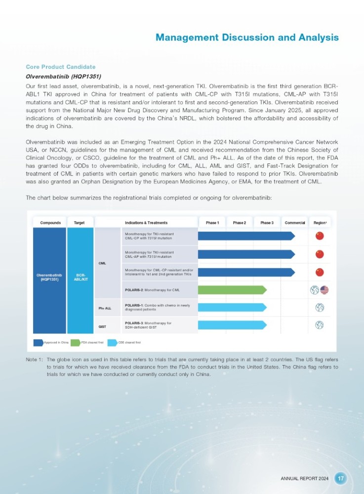 ANNUAL REPORT 2024 17 Management Discussion and Analysis Core Product Candidate Olverembatinib (HQP1351) Our first lead asset, olverembatinib, is a novel, next - generation TKI . Olverembatinib is the first third generation BCR - ABL 1 TKI approved in China for treatment of patients with CML - CP with T 315 I mutations, CML - AP with T 315 I mutations and CML - CP that is resistant and/or intolerant to first and second - generation TKIs . Olverembatinib received support from the National Major New Drug Discovery and Manufacturing Program . Since January 2025 , all approved indications of olverembatinib are covered by the China ’ s NRDL, which bolstered the affordability and accessibility of the drug in China . Olverembatinib was included as an Emerging Treatment Option in the 2024 National Comprehensive Cancer Network USA, or NCCN, guidelines for the management of CML and received recommendation from the Chinese Society of Clinical Oncology, or CSCO, guideline for the treatment of CML and Ph+ ALL . As of the date of this report, the FDA has granted four ODDs to olverembatinib, including for CML, ALL, AML and GIST, and Fast - Track Designation for treatment of CML in patients with certain genetic markers who have failed to respond to prior TKIs . Olverembatinib was also granted an Orphan Designation by the European Medicines Agency, or EMA, for the treatment of CML . The chart below summarizes the registrational trials completed or ongoing for olverembatinib : Note 1 : The globe icon as used in this table refers to trials that are currently taking place in at least 2 countries . The US flag refers to trials for which we have received clearance from the FDA to conduct trials in the United States . The China flag refers to trials for which we have conducted or currently conduct only in China . Approved in China FDA cleared first CDE cleared first Compounds Target Indications & Treatments Phase 1 Phase 2 Phase 3 Commercial Region¹ Monotherapy for TKI - resistant CML - CP with T315I mutation Monotherapy for TKI - resistant CML - AP with T315I mutation Monotherapy for CML - CP resistant and/or Intolerant to 1st and 2nd generation TKIs POLARIS - 2 : Monotherapy for CML POLARIS - 1 : Combo with chemo in newly diagnosed patients POLARIS - 3 : Monotherapy for SDH - deficient GIST CML Ph+ ALL GIST Olverembatinib (HQP1351) BCR - ABL/KIT