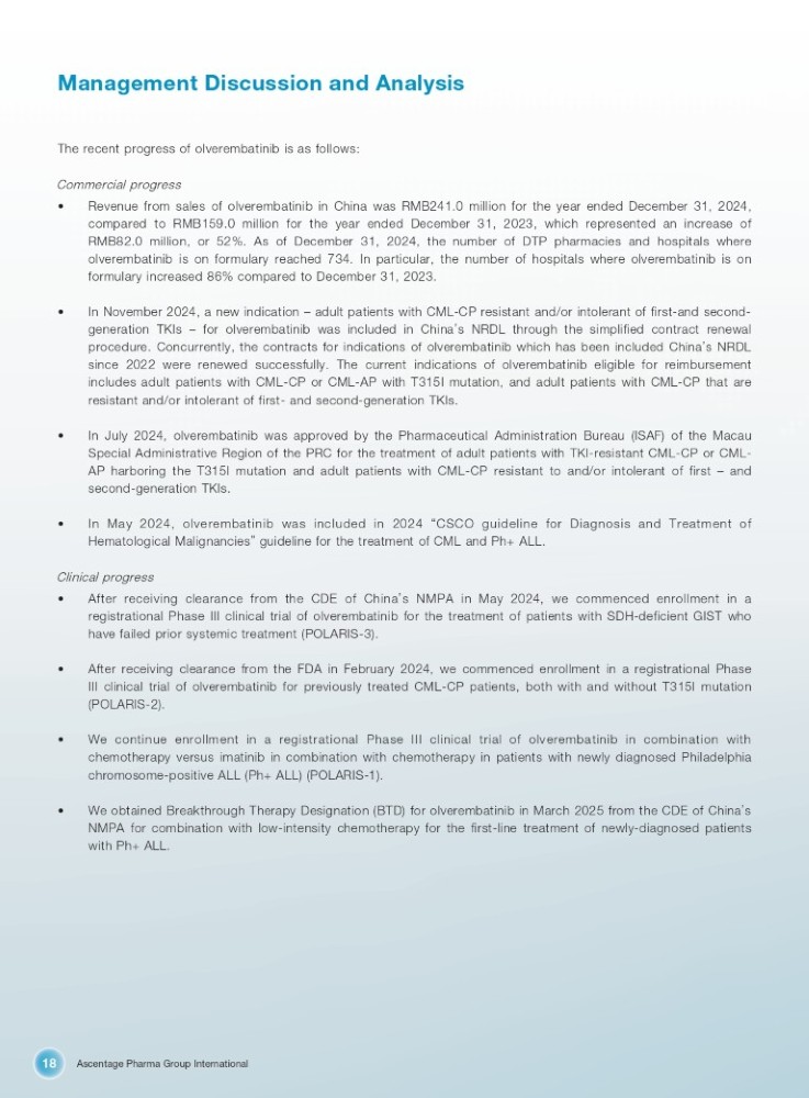 Ascentage Pharma Group International 18 Management Discussion and Analysis The recent progress of olverembatinib is as follows: Commercial progress • Revenue from sales of olverembatinib in China was RMB 241 . 0 million for the year ended December 31 , 2024 , compared to RMB 159 . 0 million for the year ended December 31 , 2023 , which represented an increase of RMB 82 . 0 million, or 52 % . As of December 31 , 2024 , the number of DTP pharmacies and hospitals where olverembatinib is on formulary reached 734 . In particular, the number of hospitals where olverembatinib is on formulary increased 86 % compared to December 31 , 2023 . • In November 2024 , a new indication – adult patients with CML - CP resistant and/or intolerant of first - and second - generation TKIs – for olverembatinib was included in China ’ s NRDL through the simplified contract renewal procedure . Concurrently, the contracts for indications of olverembatinib which has been included China ’ s NRDL since 2022 were renewed successfully . The current indications of olverembatinib eligible for reimbursement includes adult patients with CML - CP or CML - AP with T 315 I mutation, and adult patients with CML - CP that are resistant and/or intolerant of first - and second - generation TKIs . • In July 2024 , olverembatinib was approved by the Pharmaceutical Administration Bureau (ISAF) of the Macau Special Administrative Region of the PRC for the treatment of adult patients with TKI - resistant CML - CP or CML - AP harboring the T 315 I mutation and adult patients with CML - CP resistant to and/or intolerant of first – and second - generation TKIs . • In May 2024 , olverembatinib was included in 2024 “ CSCO guideline for Diagnosis and Treatment of Hematological Malignancies ” guideline for the treatment of CML and Ph+ ALL . Clinical progress • After receiving clearance from the CDE of China ’ s NMPA in May 2024 , we commenced enrollment in a registrational Phase III clinical trial of olverembatinib for the treatment of patients with SDH - deficient GIST who have failed prior systemic treatment (POLARIS - 3 ) . • After receiving clearance from the FDA in February 2024 , we commenced enrollment in a registrational Phase III clinical trial of olverembatinib for previously treated CML - CP patients, both with and without T 315 I mutation (POLARIS - 2 ) . • We continue enrollment in a registrational Phase III clinical trial of olverembatinib in combination with chemotherapy versus imatinib in combination with chemotherapy in patients with newly diagnosed Philadelphia chromosome - positive ALL (Ph+ ALL) (POLARIS - 1 ) . • We obtained Breakthrough Therapy Designation (BTD) for olverembatinib in March 2025 from the CDE of China ’ s NMPA for combination with low - intensity chemotherapy for the first - line treatment of newly - diagnosed patients with Ph+ ALL .