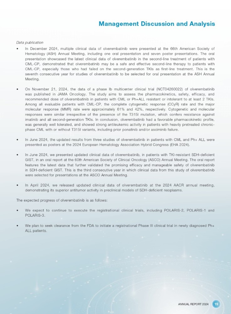 ANNUAL REPORT 2024 19 Management Discussion and Analysis Data publication • In December 2024 , multiple clinical data of olverembatinib were presented at the 66 th American Society of Hematology (ASH) Annual Meeting, including one oral presentation and seven poster presentations . The oral presentation showcased the latest clinical data of olverembatinib in the second - line treatment of patients with CML - CP, demonstrated that olverembatinib may be a safe and effective second - line therapy to patients with CML - CP, especially those who had failed on the second - generation TKIs as first - line treatment . This is the seventh consecutive year for studies of olverembatinib to be selected for oral presentation at the ASH Annual Meeting . • On November 21 , 2024 , the data of a phase Ib multicenter clinical trial (NCT 04260022 ) of olverembatinib was published in JAMA Oncology . The study aims to assess the pharmacokinetics, safety, efficacy, and recommended dose of olverembatinib in patients with CML or Ph+ALL resistant or intolerant to at least 2 TKIs . Among all evaluable patients with CML - CP, the complete cytogenetic response (CCyR) rate and the major molecular response (MMR) rate were approximately 61 % and 42 % , respectively . Cytogenetic and molecular responses were similar irrespective of the presence of the T 315 I mutation, which confers resistance against imatinib and all second - generation TKIs . In conclusion, olverembatinib had a favorable pharmacokinetic profile, was generally well tolerated, and showed strong antileukemic activity in patients with heavily pretreated chronic - phase CML with or without T 315 I variants, including prior ponatinib and/or asciminib failure . • In June 2024 , the updated results from three studies of olverembatinib in patients with CML and Ph+ ALL were presented as posters at the 2024 European Hematology Association Hybrid Congress (EHA 2024 ) . • In June 2024 , we presented updated clinical data of olverembatinib, in patients with TKI - resistant SDH - deficient GIST, in an oral report at the 60 th American Society of Clinical Oncology (ASCO) Annual Meeting . The oral report features the latest data that further validated the promising efficacy and manageable safety of olverembatinib in SDH - deficient GIST . This is the third consecutive year in which clinical data from this study of olverembatinib were selected for presentations at the ASCO Annual Meeting . • In April 2024 , we released updated clinical data of olverembatinib at the 2024 AACR annual meeting, demonstrating its superior antitumor activity in preclinical models of SDH - deficient neoplasms . The expected progress of olverembatinib is as follows: • We expect to continue to execute the registrational clinical trials, including POLARIS - 2 , POLARIS - 1 and POLARIS - 3 . • We plan to seek clearance from the FDA to initiate a registrational Phase III clinical trial in newly diagnosed Ph+ ALL patients .