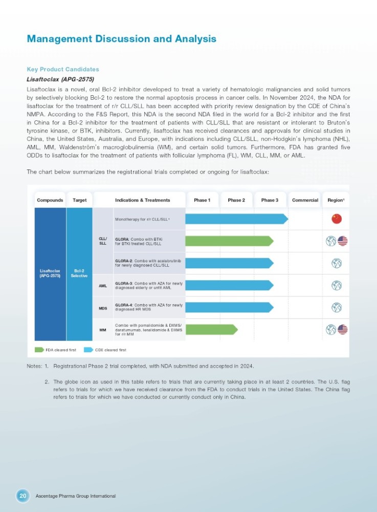 Ascentage Pharma Group International 20 Management Discussion and Analysis Key Product Candidates Lisaftoclax (APG - 2575) Lisaftoclax is a novel, oral Bcl - 2 inhibitor developed to treat a variety of hematologic malignancies and solid tumors by selectively blocking Bcl - 2 to restore the normal apoptosis process in cancer cells . In November 2024 , the NDA for lisaftoclax for the treatment of r/r CLL/SLL has been accepted with priority review designation by the CDE of China ’ s NMPA . According to the F&S Report, this NDA is the second NDA filed in the world for a Bcl - 2 inhibitor and the first in China for a Bcl - 2 inhibitor for the treatment of patients with CLL/SLL that are resistant or intolerant to Bruton ’ s tyrosine kinase, or BTK, inhibitors . Currently, lisaftoclax has received clearances and approvals for clinical studies in China, the United States, Australia, and Europe, with indications including CLL/SLL, non - Hodgkin ’ s lymphoma (NHL), AML, MM, Waldenström ’ s macroglobulinemia (WM), and certain solid tumors . Furthermore, FDA has granted five ODDs to lisaftoclax for the treatment of patients with follicular lymphoma (FL), WM, CLL, MM, or AML . The chart below summarizes the registrational trials completed or ongoing for lisaftoclax : Notes: 1 . Registrational Phase 2 trial completed, with NDA submitted and accepted in 2024. 2 . The globe icon as used in this table refers to trials that are currently taking place in at least 2 countries . The U . S . flag refers to trials for which we have received clearance from the FDA to conduct trials in the United States . The China flag refers to trials for which we have conducted or currently conduct only in China . Compounds Target Indications & Treatments Phase 1 Phase 2 Phase 3 Commercial Region¹ Monotherapy for r/r CLL/SLL¹ CLL/ GLORA : Combo with BTKi SLL for BTKi treated CLL/SLL GLORA - 2 : Combo with acalabrutinib for newly diagnosed CLL/SLL Lisaftoclax Bcl - 2 (APG - 2575) Selective AML GLORA - 3 : Combo with AZA for newly diagnosed elderly or unfit AML GLORA - 4 : Combo with AZA for newly MDS diagnosed HR MDS Combo with pomalidomide & DXMS/ MM daratumumab, lenalidomide & DXMS for r/r MM FDA cleared first CDE cleared first